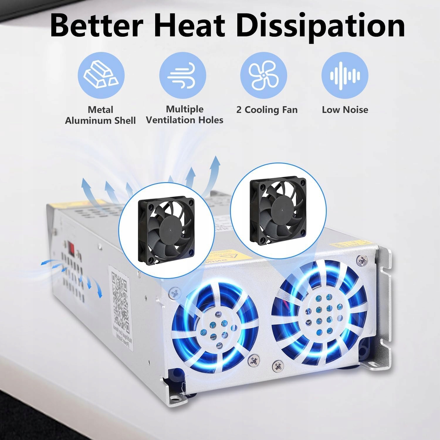 Inteligentne chłodzenie: Zasilacz 12V 1500W z matową aluminiową obudową, wyposażony w liczne otwory wentylacyjne, wbudowany wentylator i siatkę przeciwpyłową. Skutecznie zapobiega przedostawaniu się kurzu, zapewnia stabilną pracę wentylatora i chroni płytę obwodów przed przegrzaniem.