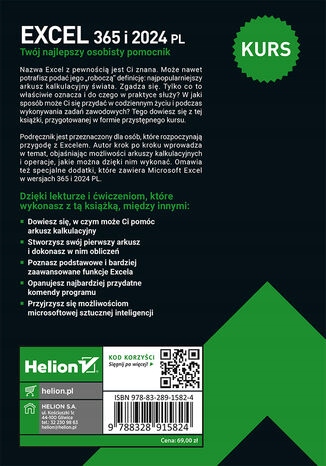 Excel - Twój najlepszy osobisty pomocnikNazwa Excel z pewnością jest Ci znana. Może nawet potrafisz podać jego "roboczą" definicję: najpopularniejszy arkusz kalkulacyjny świata. Zgadza się. Tylko co to właściwie oznacza i do czego w praktyce służy? W jaki sposób może Ci się przydać w codziennym życiu i podczas wykonywania zadań zawodowych? Tego dowiesz się z tej książki, przygotowanej w formie przystępnego kursu.Podręcznik jest przeznaczony dla osób, które rozpoczynają przygodę z Excelem. Autor krok po kroku wprowadza w temat, objaśniając możliwości arkuszy kalkulacyjnych i operacje, jakie można dzięki nim wykonać. Omawia też specjalne dodatki, które zawiera Microsoft Excel w wersjach 365 i 2024 PL****ięki lekturze i ćwiczeniom, które wykonasz z tą książką, między innymi:Dowiesz się, w czym może Ci pomóc arkusz kalkulacyjnyStworzysz swój pierwszy arkusz i dokonasz w nim obliczeńPoznasz podstawowe i bardziej zaawansowane funkcje ExcelaOpanujesz najbardziej przydatne komendy programuPrzyjrzysz się możliwościom microsoftowej sztucznej inteligencji
