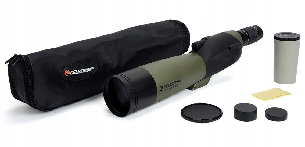 Luneta Celestron Ultima 80 mm, nakrywka na obiektyw, okular zoom 8-21 mm, pokrowiec, ściereczka do optyki, dokumentacja.