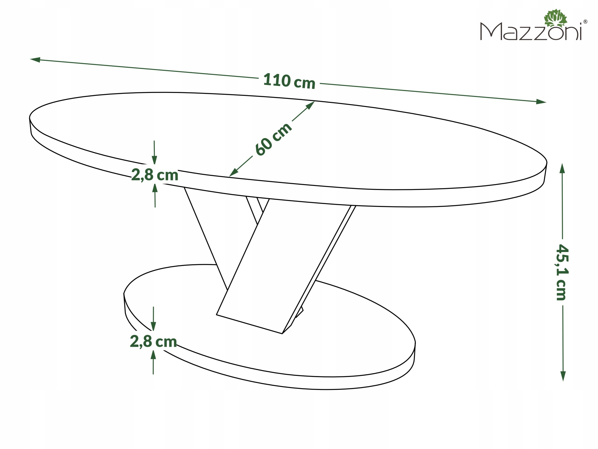 Jego owalny blat osadzony jest na efektownej podstawie w formie dwóch ukośnie ustawionych nóg, tworzących dynamiczną kompozycję litery „V”. Całość wspiera się na solidnej, owalnej podstawie, która zapewnia stabilność i podkreśla elegancki charakter stolika.
