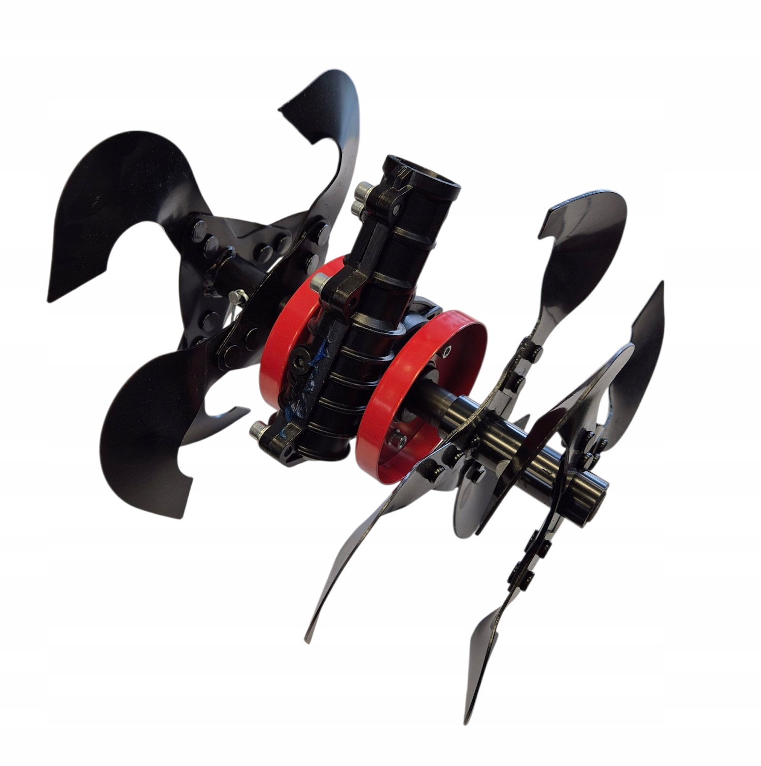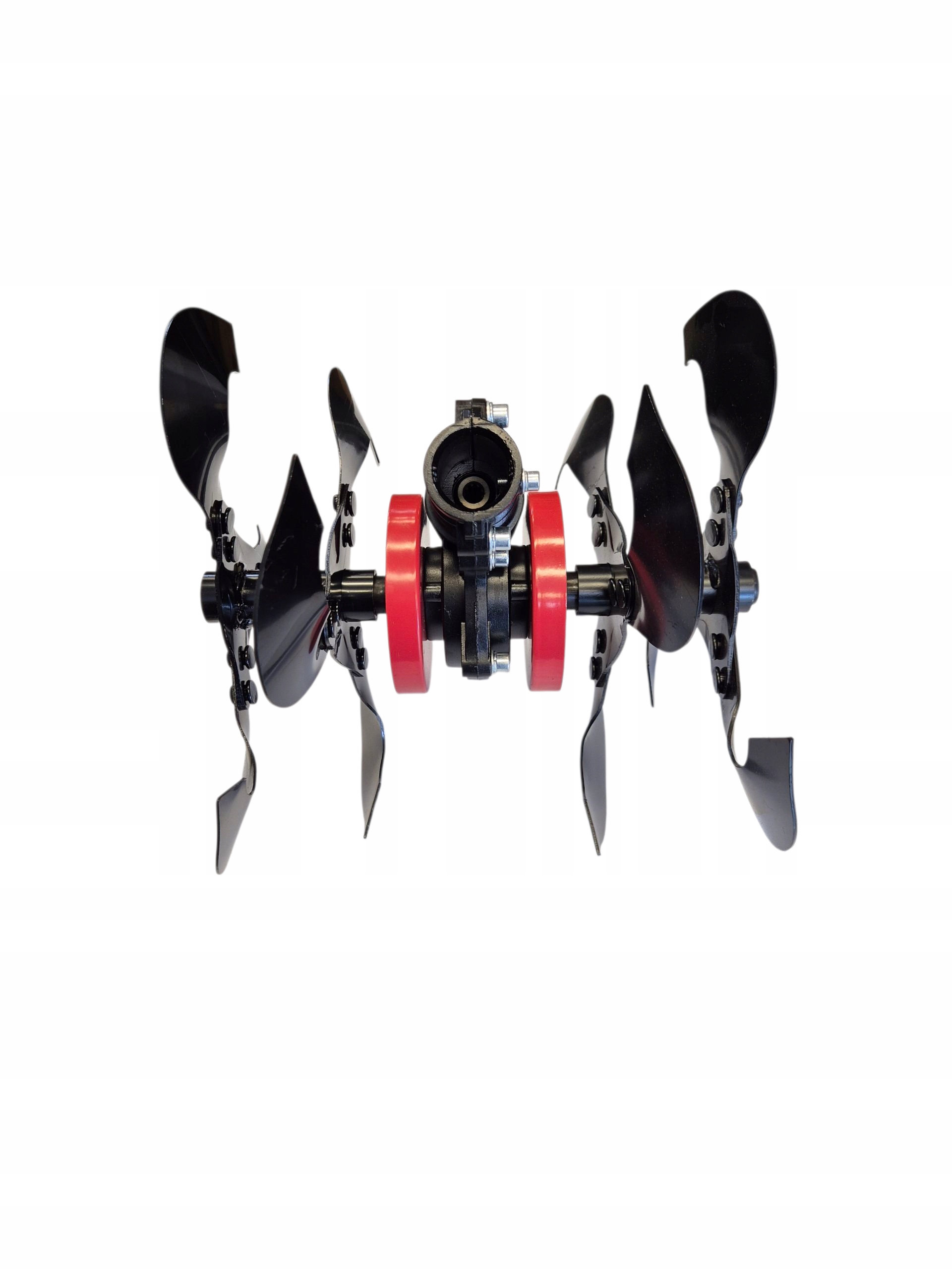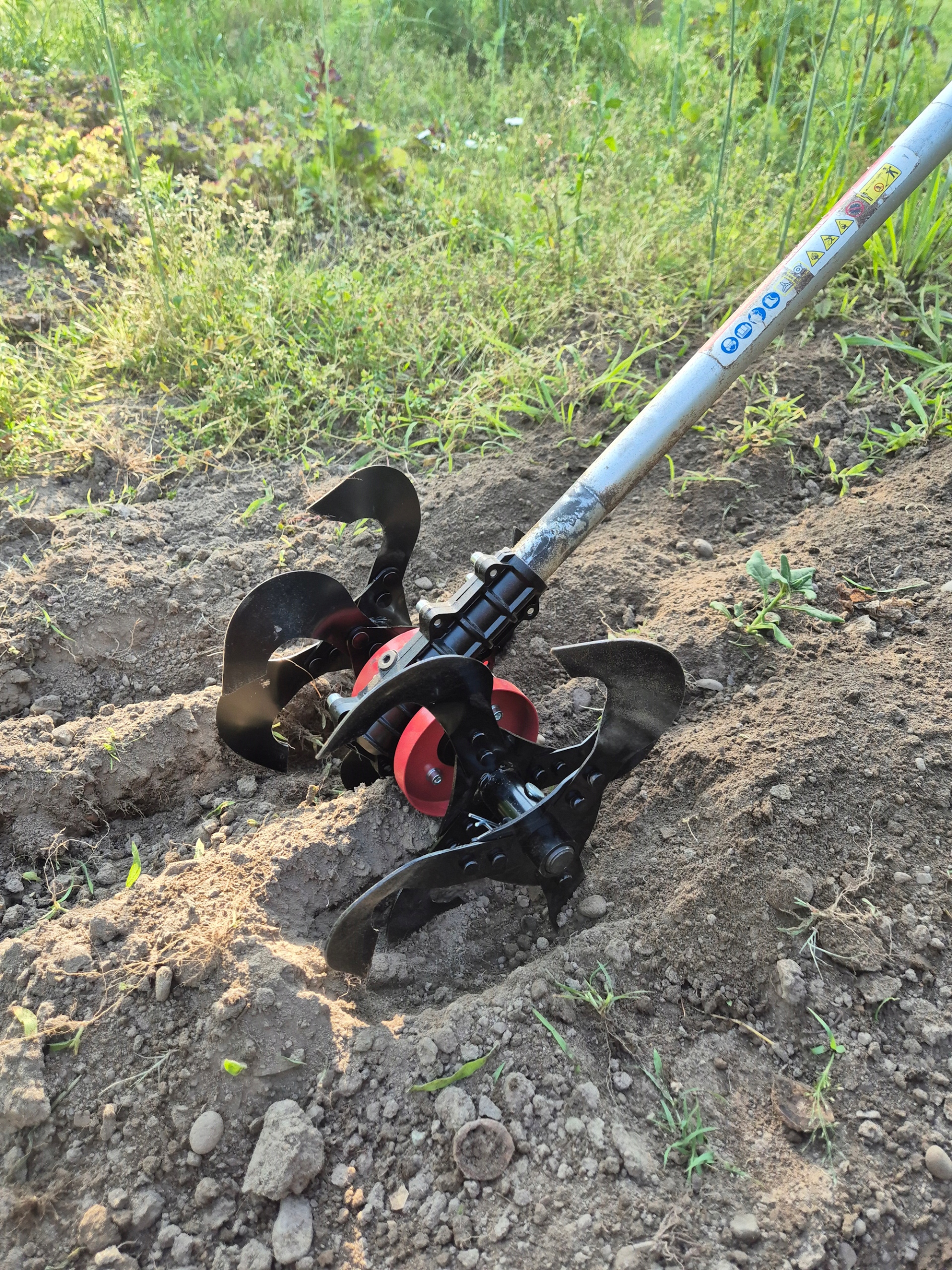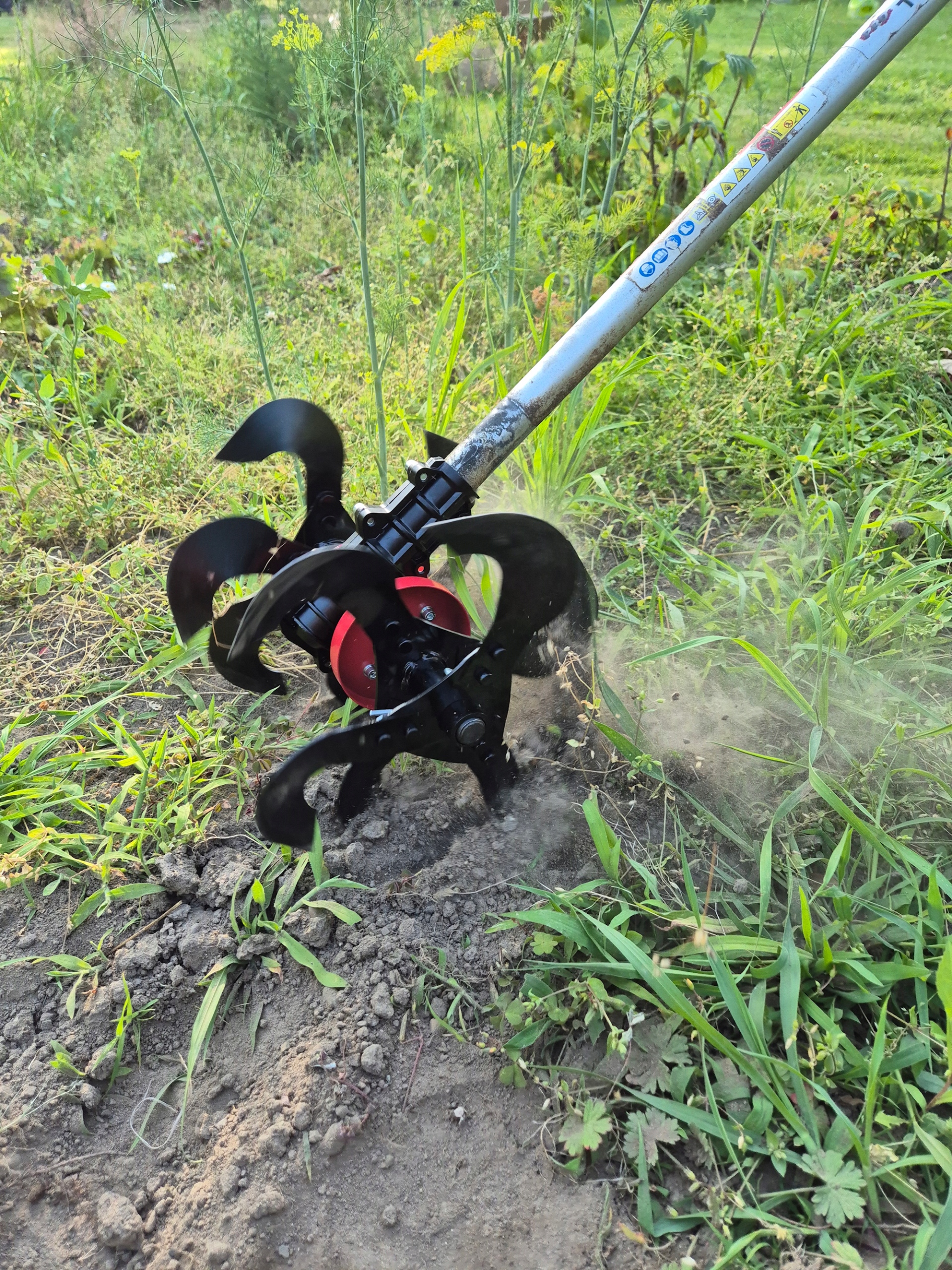 Przystawka do kosy spalinowej - glebogryzarka umożliwia spulchnianie i napowietrzanie gleby w celu przygotowania podłoża pod uprawę roślin.