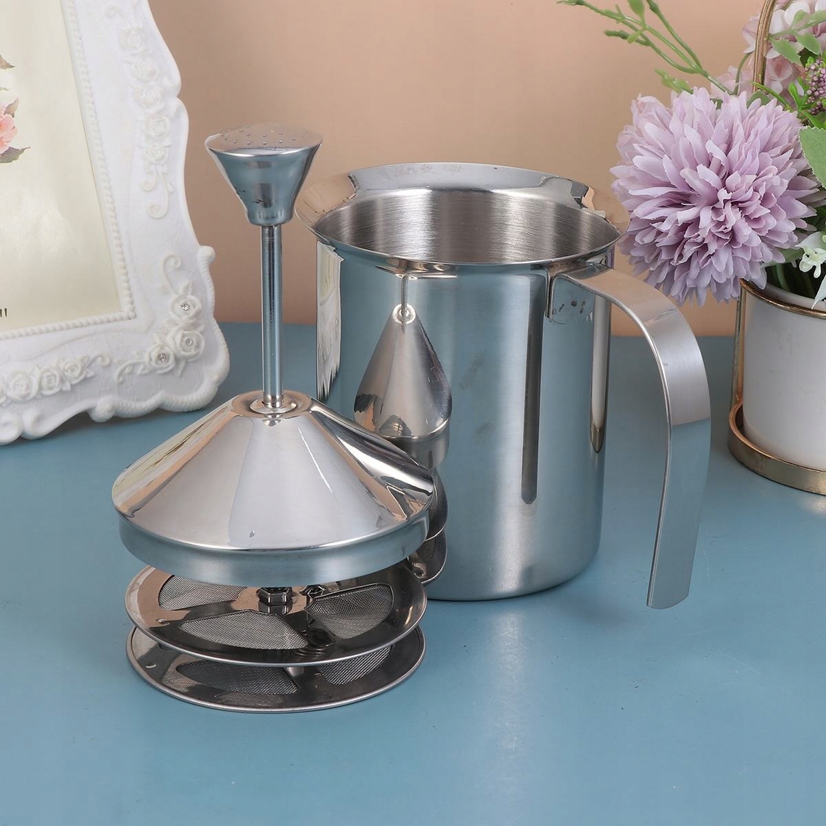 ✅Dodaj mleko do garnka, umieść tłok w środku i zabezpiecz pokrywkę, pompuj pokrętło około 30s, aż bańka i mleko się zmieszają, a następnie wylej.