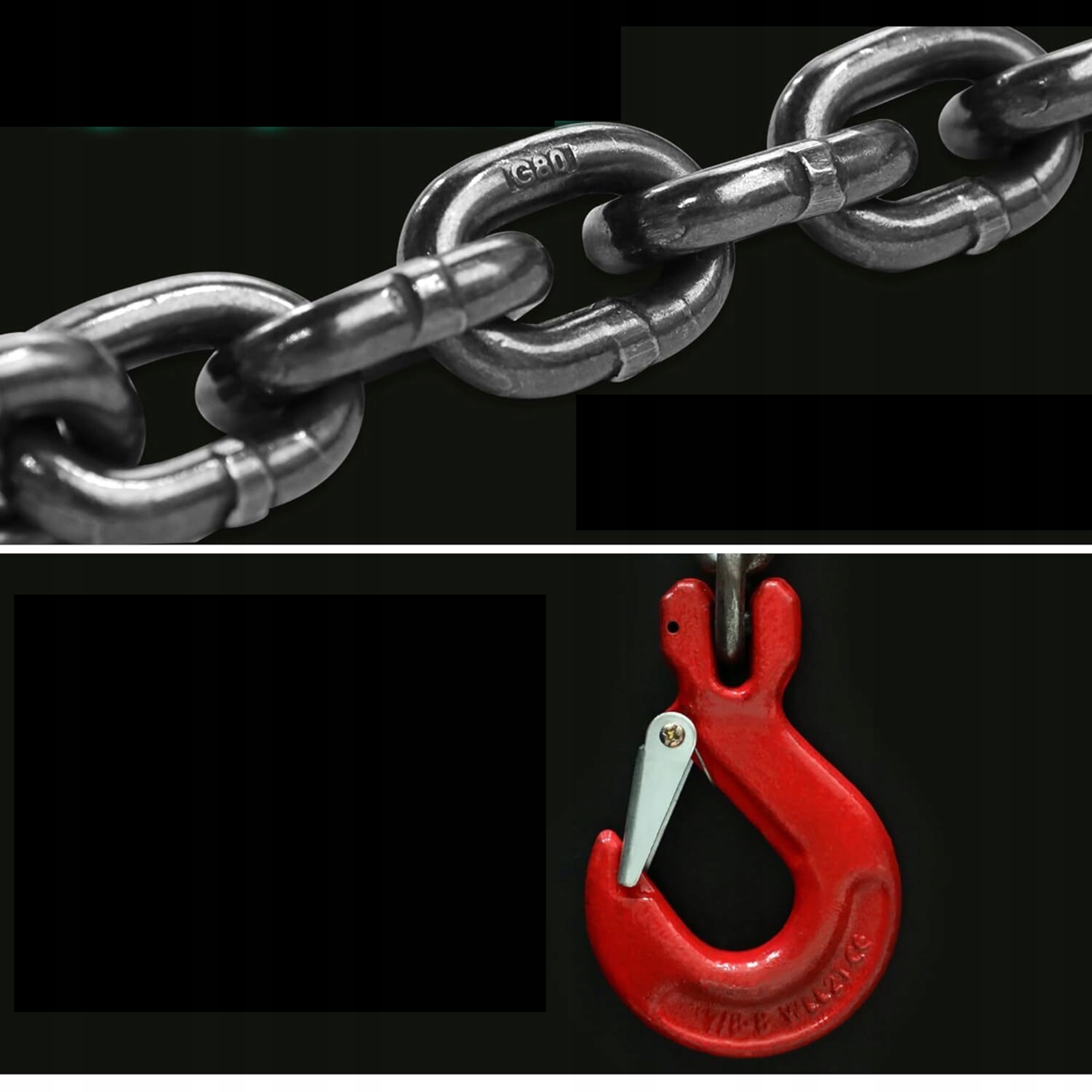 Zawiesie łańcuchowe czterocięgnowe wykonane ze stali klasy 8. Wyposażone w haki skracające umożliwiające regulację długości roboczej cięgien. Produkt przeznaczony do pracy w warunkach przemysłowych, gdzie wymagana jest duża wytrzymałość i elastyczność zastosowania.