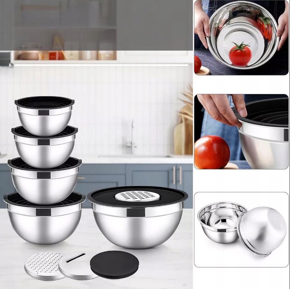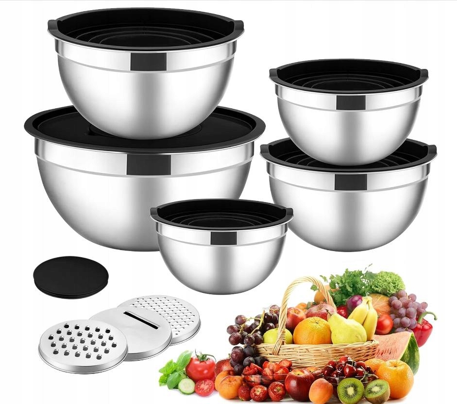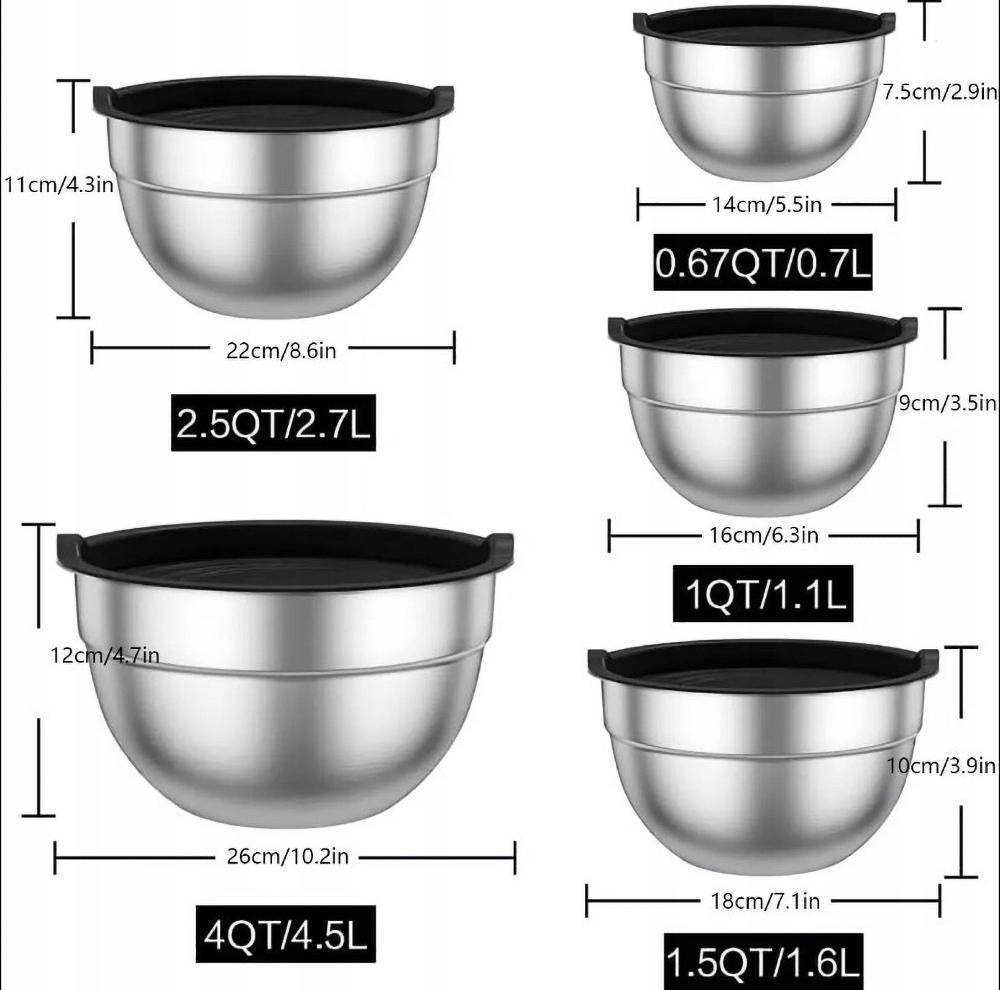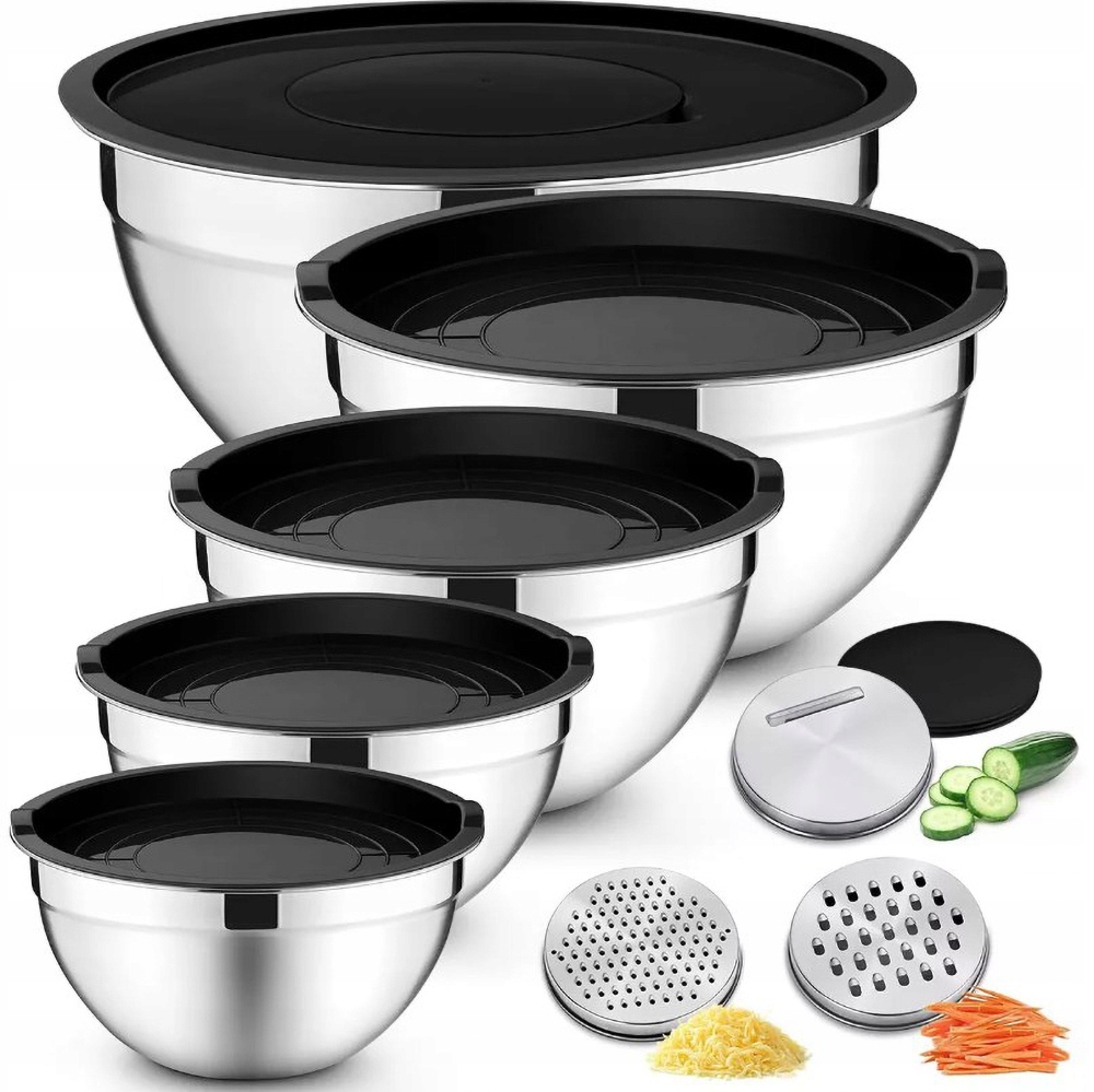 ➡️W zestawie - 5-częściowa miska sałatkowa z pokrywką (4 qt/4,5 l, 2,5 qt/2,7 l, 1,5 qt/1,6 l, 1 qt/1,1 l, 0,67 qt/0,7 l), w zestawie 3 szatkownice/nożyce.
