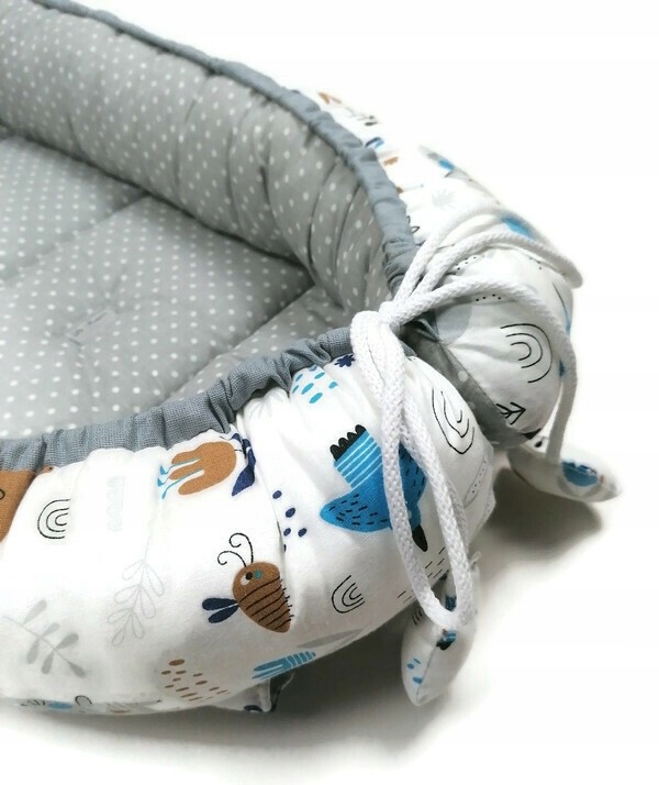 Кокон заполнен антиаллергенным силиконовым шариком, дно кокона заполнено антиаллергенный мягкий силиконовый овес. Все сшито из 100% хлопка, шнуры для завязывания они тоже хлопковые.