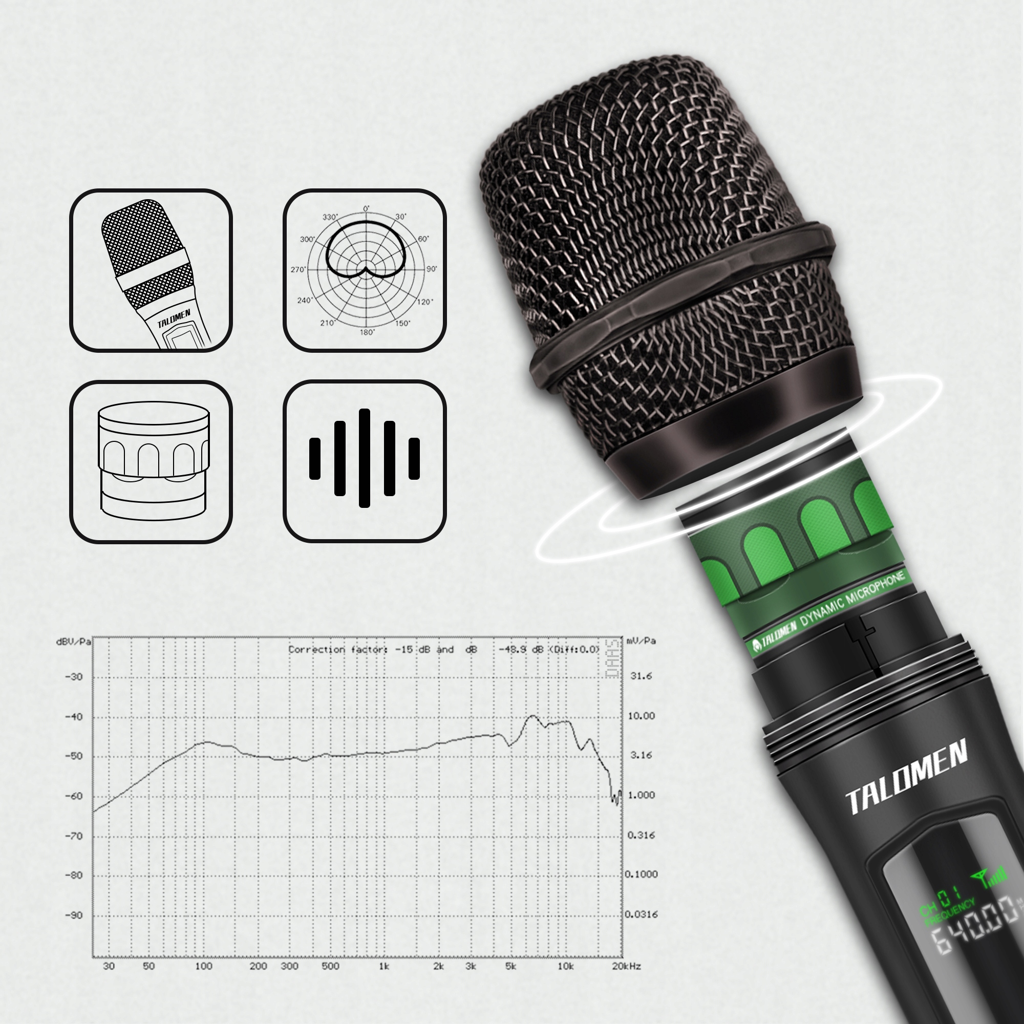 Ten dynamiczny mikrofon bezprzewodowy ma wbudowany profesjonalny chipset i piankę z redukcją szumów, która zapewnia ciepły i miękki dźwięk z doskonałym odrzucaniem sprzężeń zwrotnych, odtwarzając czysty i pozbawiony zniekształceń dźwięk, jednocześnie skutecznie redukując hałas generowany podczas użytkowania, co przekłada się na doskonały dźwięk przy minimalnych szumach i zniekształceniach. Talomen podwójny profesjonalny mikrofon maksymalizuje zysk wcześniej sprzężenia zwrotnego. , dzięki czemu Twój głos wyróżnia się bez wysiłku.