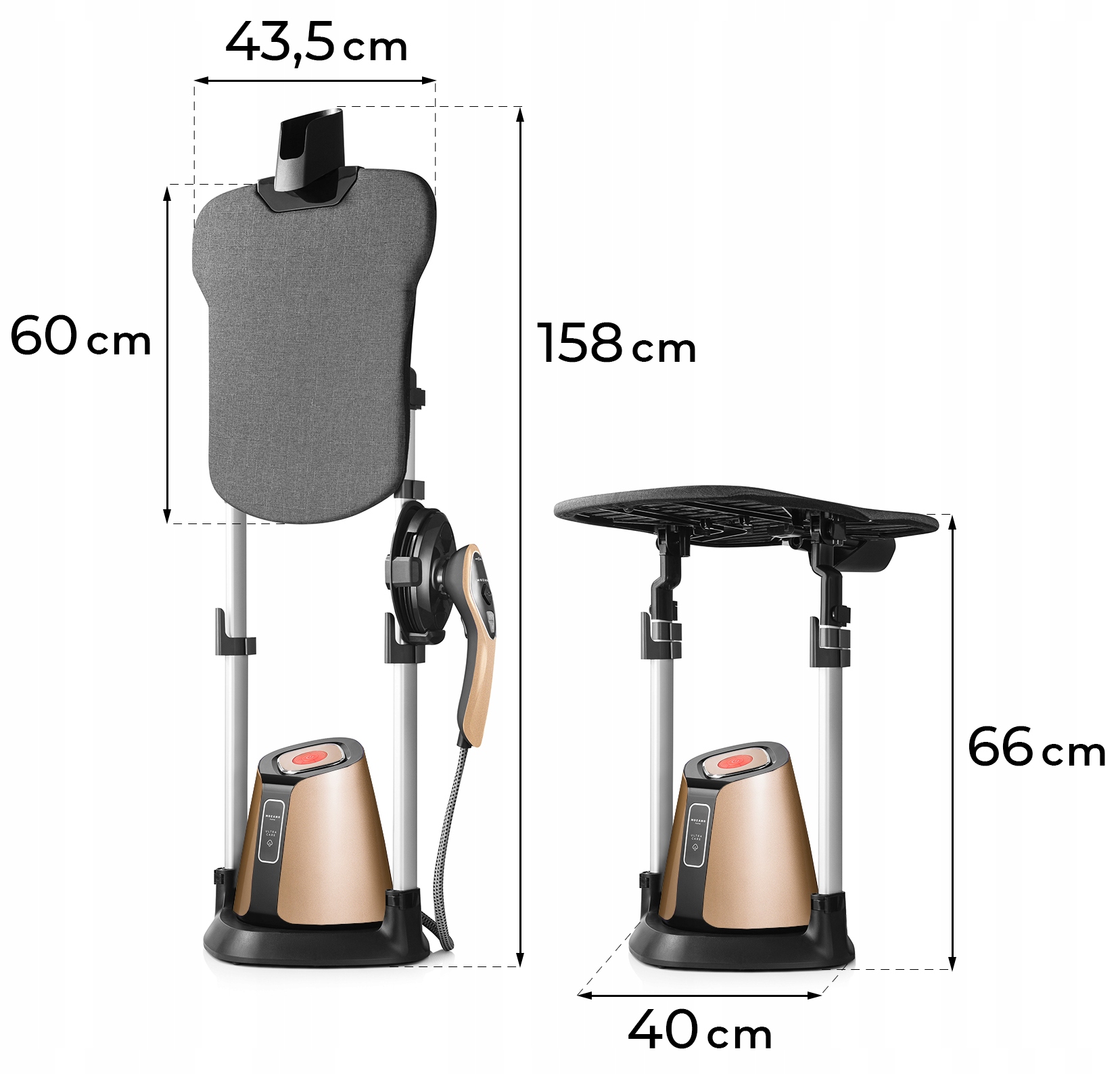 Teleskopowa regulowana deska umożliwiająca prasowanie w trzech różnych pozycjach: poziomej, pionowej oraz pod kątem 30 stopni, z przy pomocy regulowanej wysokości, idealnie dostosujesz ją do siebie.