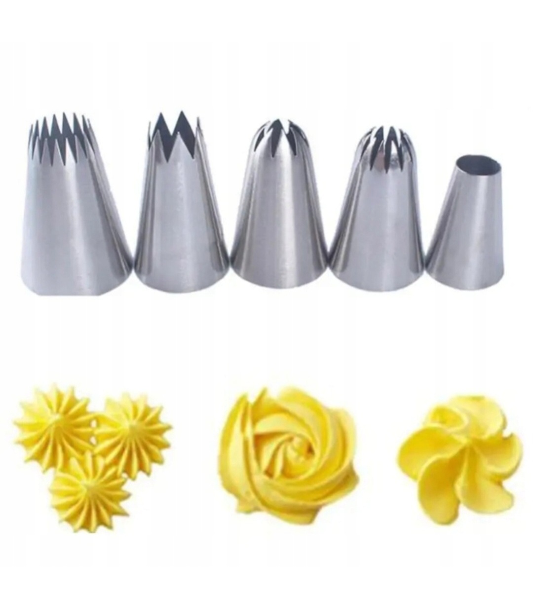 Zestaw cukierniczy zawiera 5 sztuki tylek, które doskonale sprawdzą się do precyzyjnego dekorowania ciast, ciastek, muffinek.