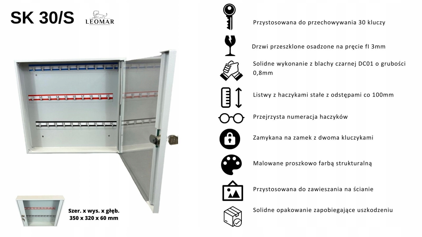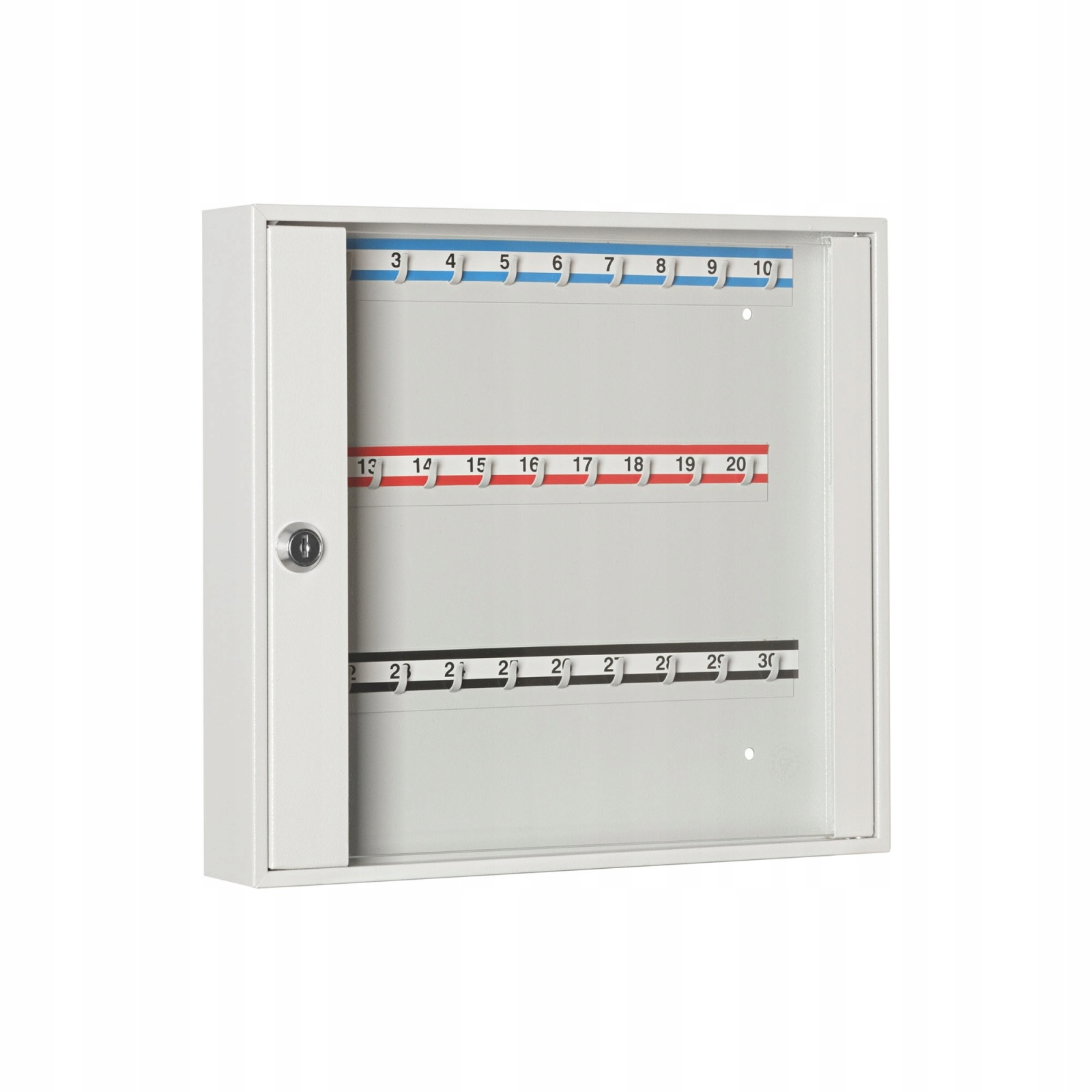 Szafka metalowa na klucze SK 30/S z szybą hartowaną to praktyczna i trwała metalowa skrzynka na klucze, która pozwala w bezpieczny sposób przechowywać do 30 kluczy. Doskonały wybór do biura, warsztatu, firmy, jak i do zastosowań domowych.
