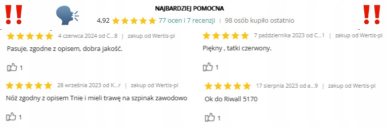 Na inne aukcji (wariant powyżej przycisku kup teraz) posiadamy nóż w wersji wyrzutowej. Doskonale nadaje się do kosiarek z wyrzutem bocznym lub koszem na trawę. Geometria listwy zapewnia skuteczne cięcie i zbieranie trawy do momentu aż kosz wypełni się po brzegi.