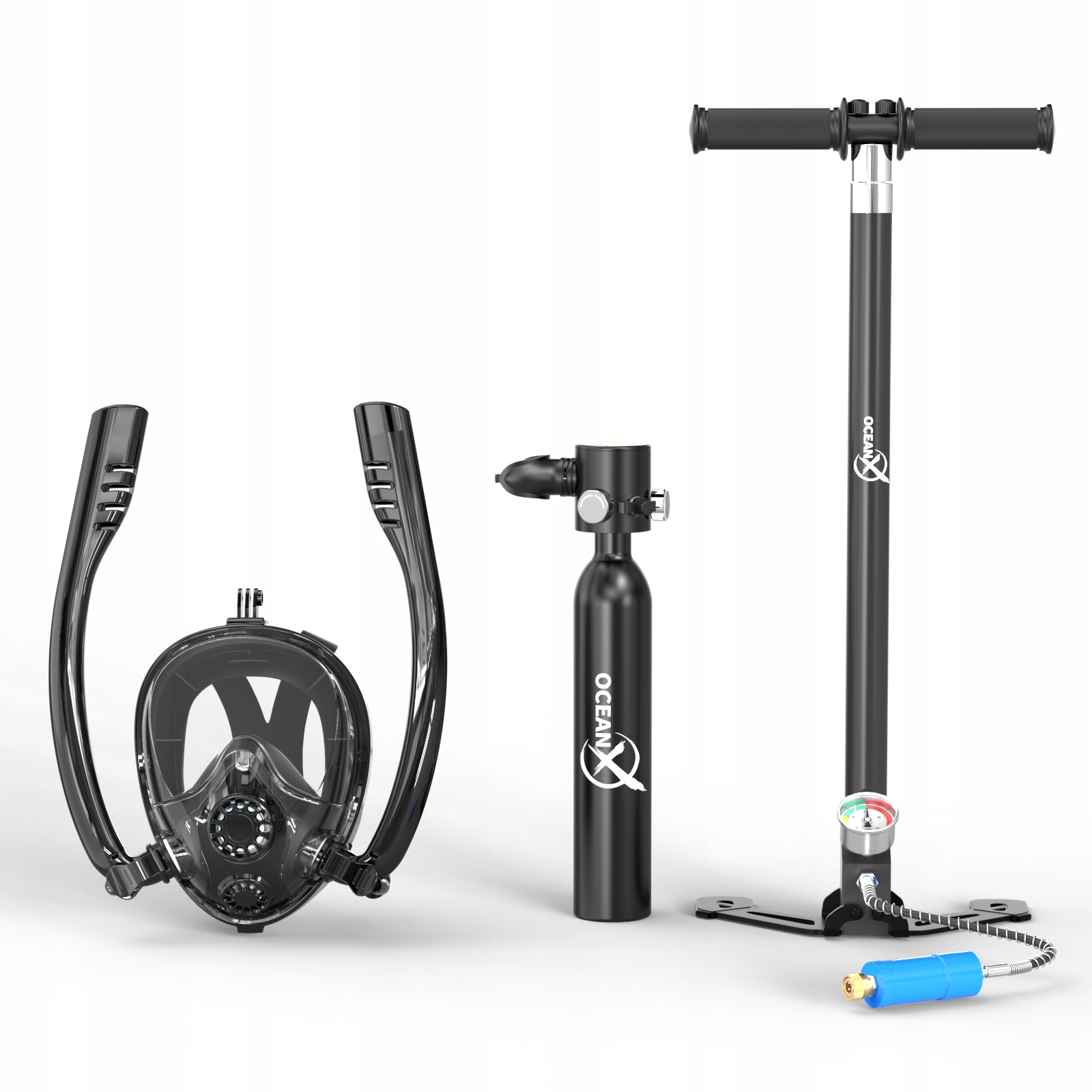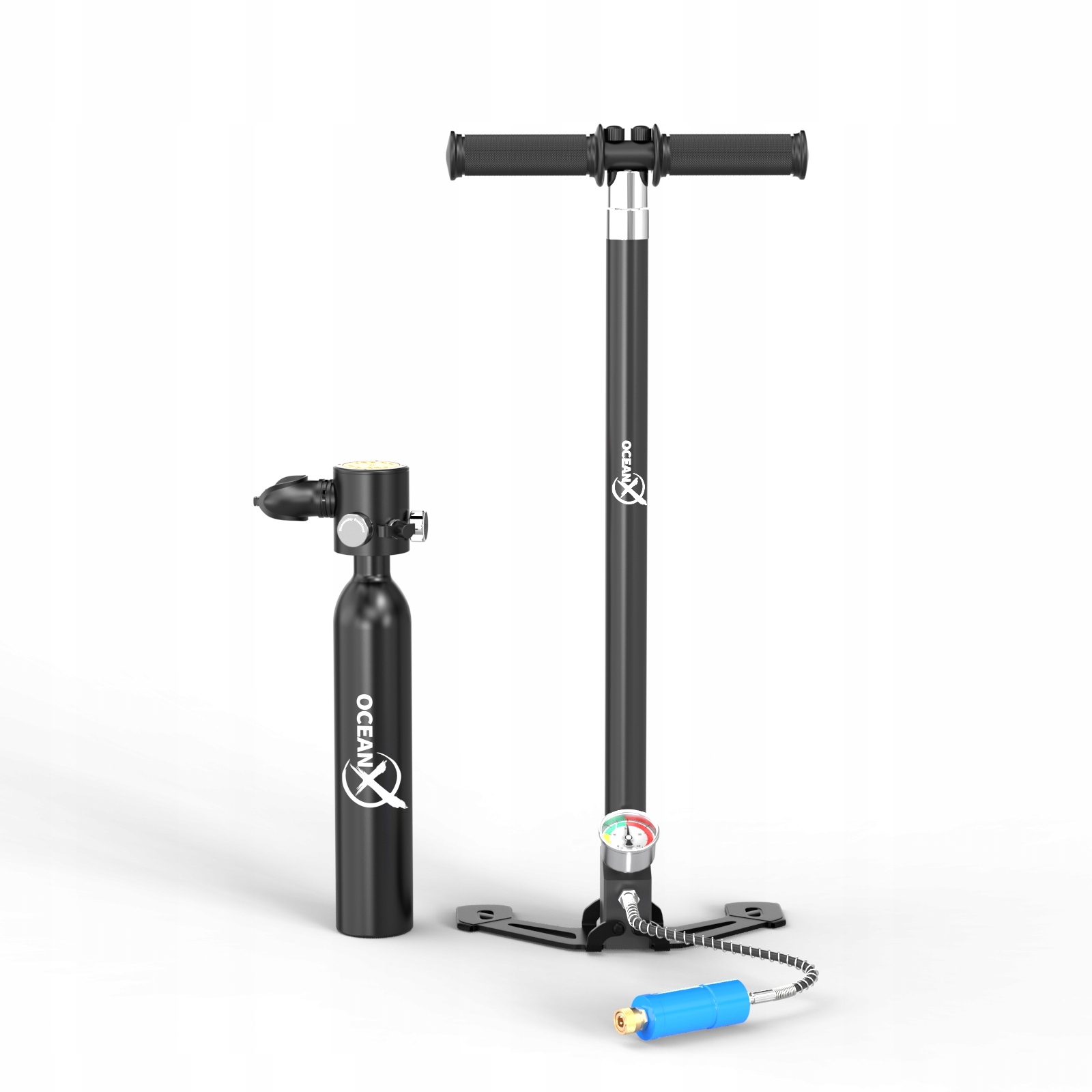 W zestawie znajduje się również pompka OceanX do napełniania butli tlenowej. Pompka jest prosta w obsłudze i umożliwia szybkie oraz efektywne napełnianie butli, co sprawia, że zawsze jesteś gotowy do kolejnej podwodnej wyprawy. Dzięki temu rozwiązaniu możesz cieszyć się nieprzerwanym nurkowaniem bez długich przerw na ładowanie.