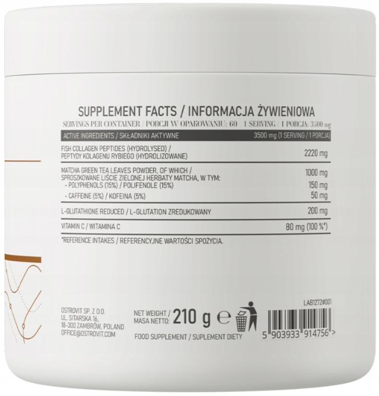 Peptydy kolagenu rybiego (hydrolizowane), Sproszkowane liście zielonej herbaty Matcha (Camellia sinensis L.) standaryzowane na 15% polifenoli oraz 5% kofeiny, L-glutation zredukowany, witamina C (kwas L-askorbinowy).