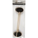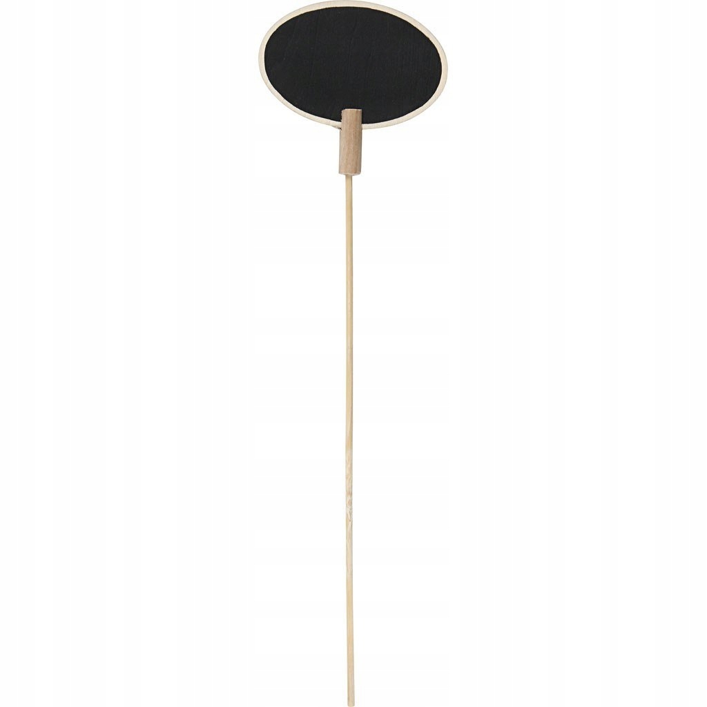 Drewniane tabliczki o owalnym kształcie na patyku. Front tabliczki jest pokryty czarną farbą.