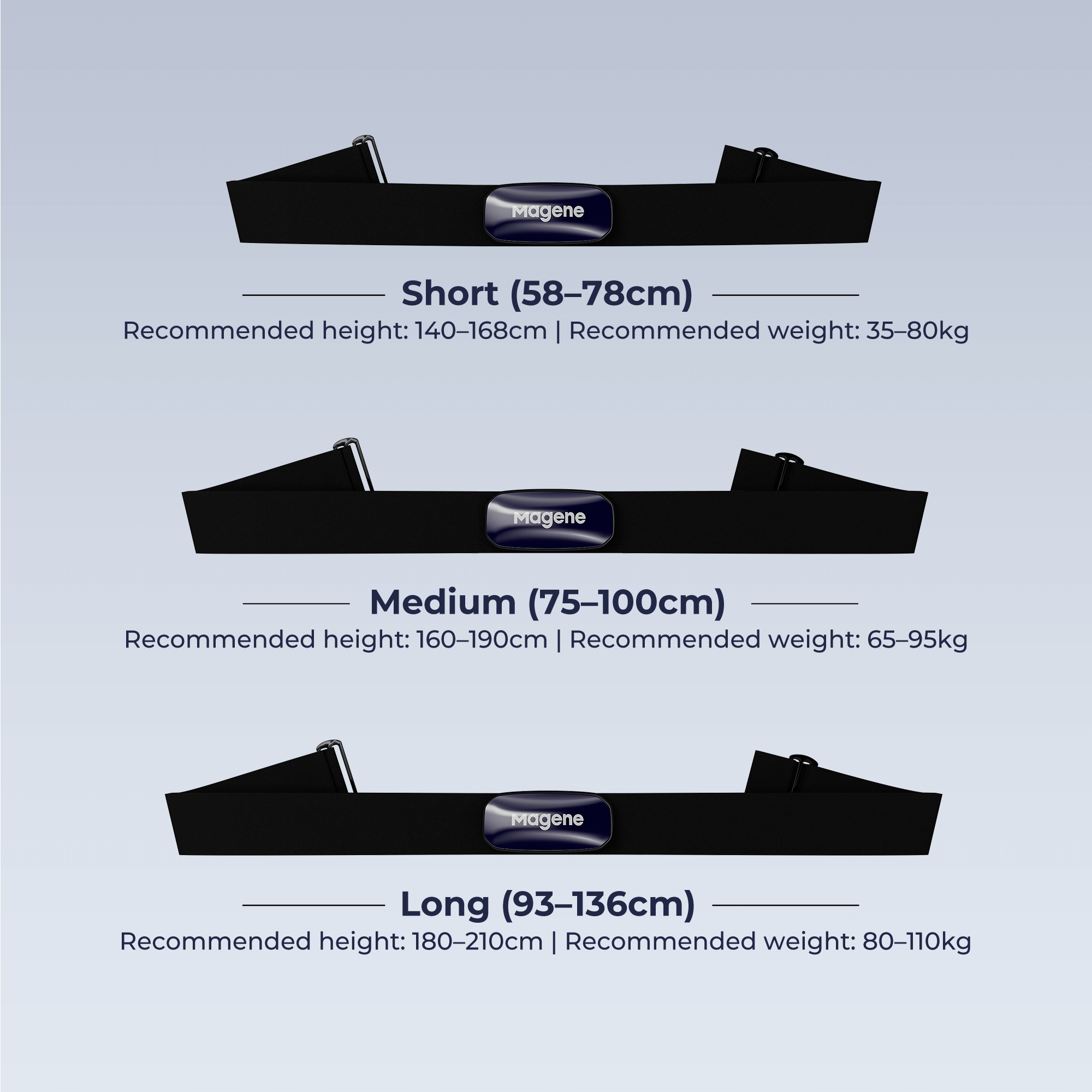 Czujnik występuje w trzech rozmiarach opaski na klatkę piersiową: