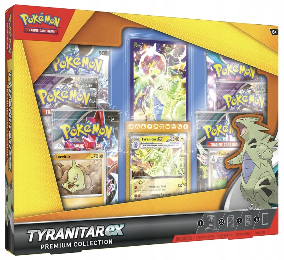 Przedmiotem sprzedaży jest nowy, oryginalnie zafoliowany zestaw Pokemon TCG: Tyranitar ex Premium Collection.