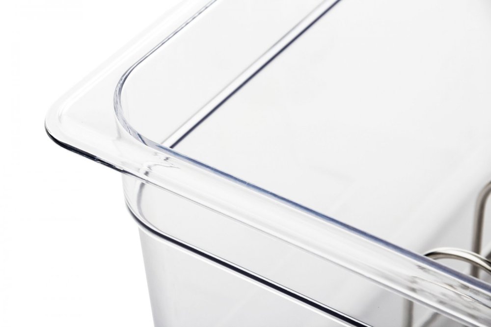 Naczynie do gotowania sous-vide G21 jest wykonane z poliwęglanu o wysokiej wytrzymałości, bardziej niż metalowe garnki, skuteczniej utrzymuje temperaturę i zajmuje mniej czasu na podgrzanie kąpieli wodnej. Poliwęglan spełnia najsurowsze wymogi bezpieczeństwa i nie jest szkodliwy dla zdrowia. Dzięki wysokiej stabilności zastosowanego materiału można go myć w zmywarce, co pozwala zaoszczędzić sporo czasu i wysiłku. Pojemnik jest również wyposażony w zdejmowaną pokrywę z wycięciem na szybkowar sous-vide. Jednak pokrywka może być również używana z wolnowarem innej marki, ponieważ większość wolnowarów na rynku, zmieści się w otworze.