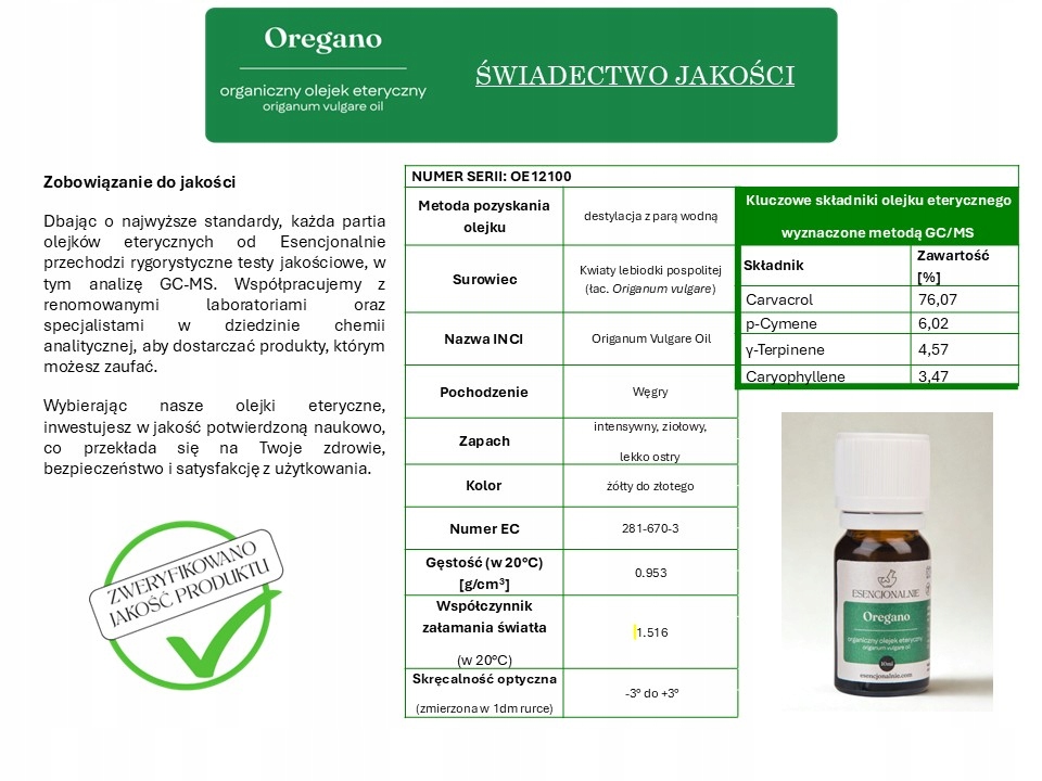 Świadectwo jakości wystawiane przez Esencjonalnie zawiera informacje na temat danego olejku, a także wyniki badań jakościowych oraz ilościowych każdej partii produktu. W karcie produktu znajduje się również wykaz naturalnie występujących w olejku alergenów zapachowych oraz certyfikat zgodności z normami IFRA.