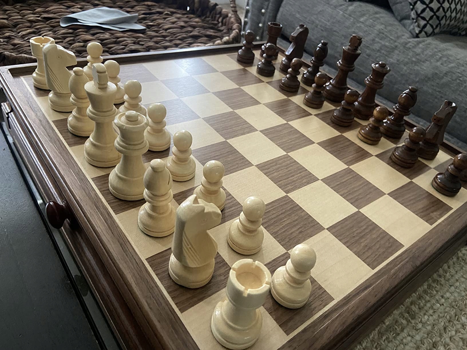 ✨ Drewniane szachownice i elementy są wykonane z wysokiej jakości litego drewna, o doskonałej trwałości, pogrubiona rama zapobiega deformacji pudełka szachowego, z mosiężnymi guzikami, wykwintne wykonanie i realistyczne.