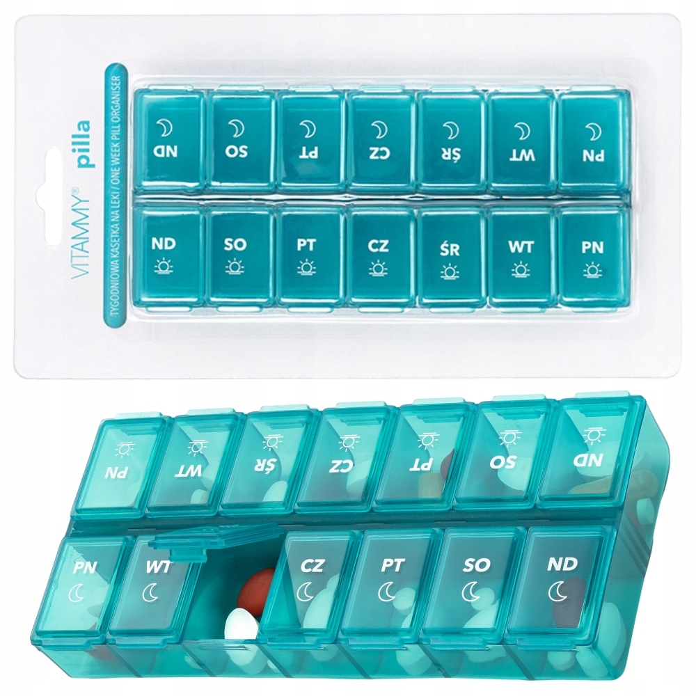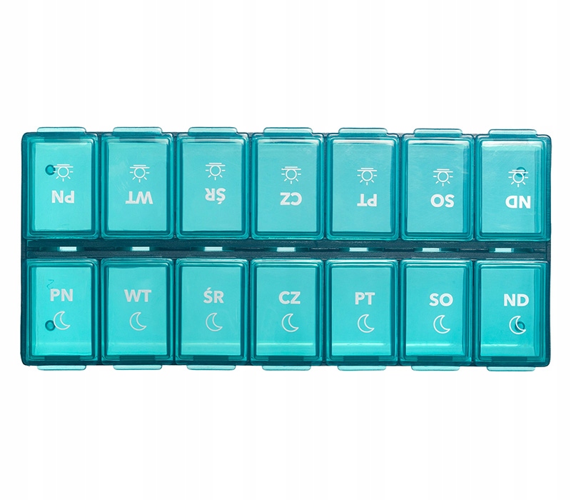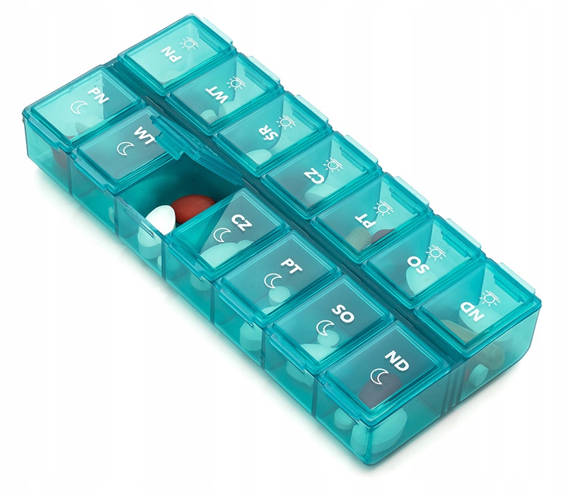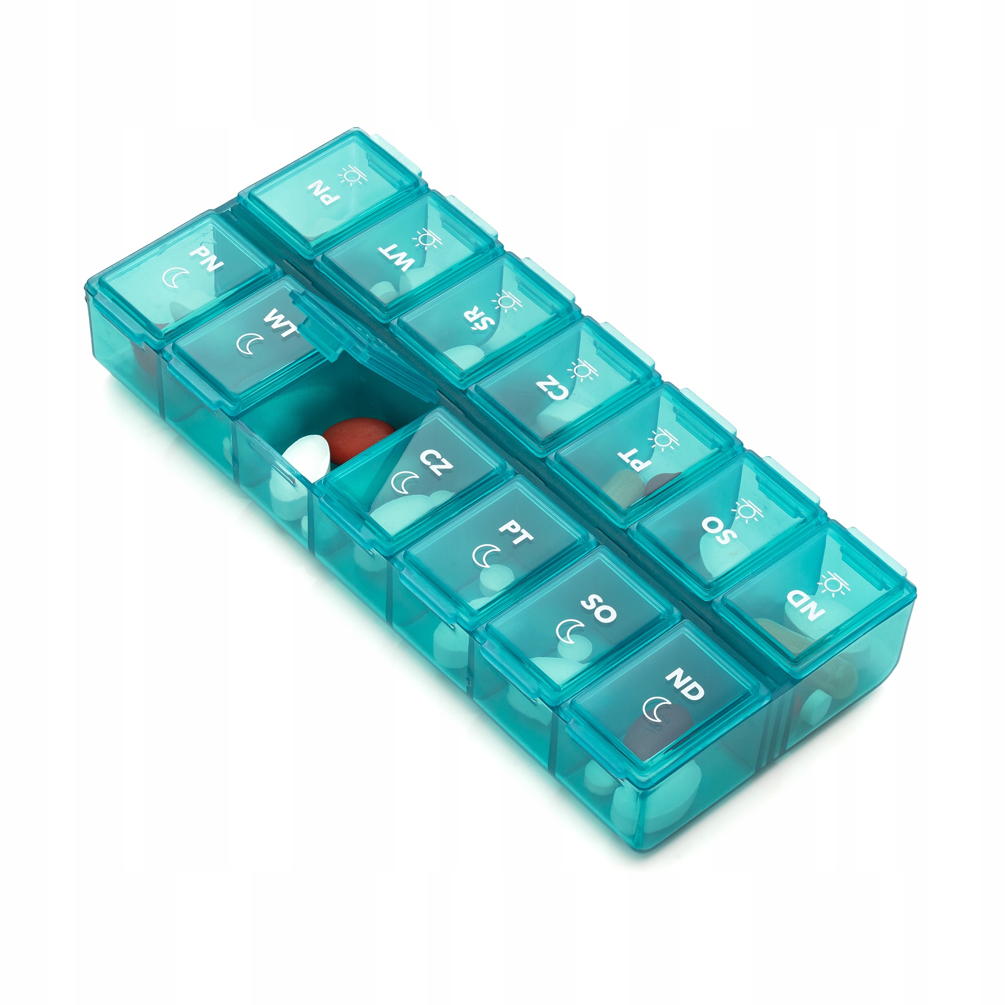 Każdy dzień został podzielony na 2 osobne przegrody – na poranną i wieczorną dawkę. To wygodne rozwiązanie dla osób, które przyjmują leki dwa razy dziennie i chcą mieć wszystko pod ręką.