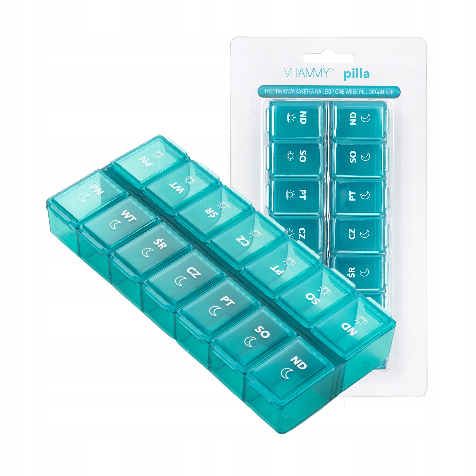 Vitammy Pilla to praktyczna kasetka na 7 dni tygodnia, która pomaga w uporządkowaniu codziennego przyjmowania leków.