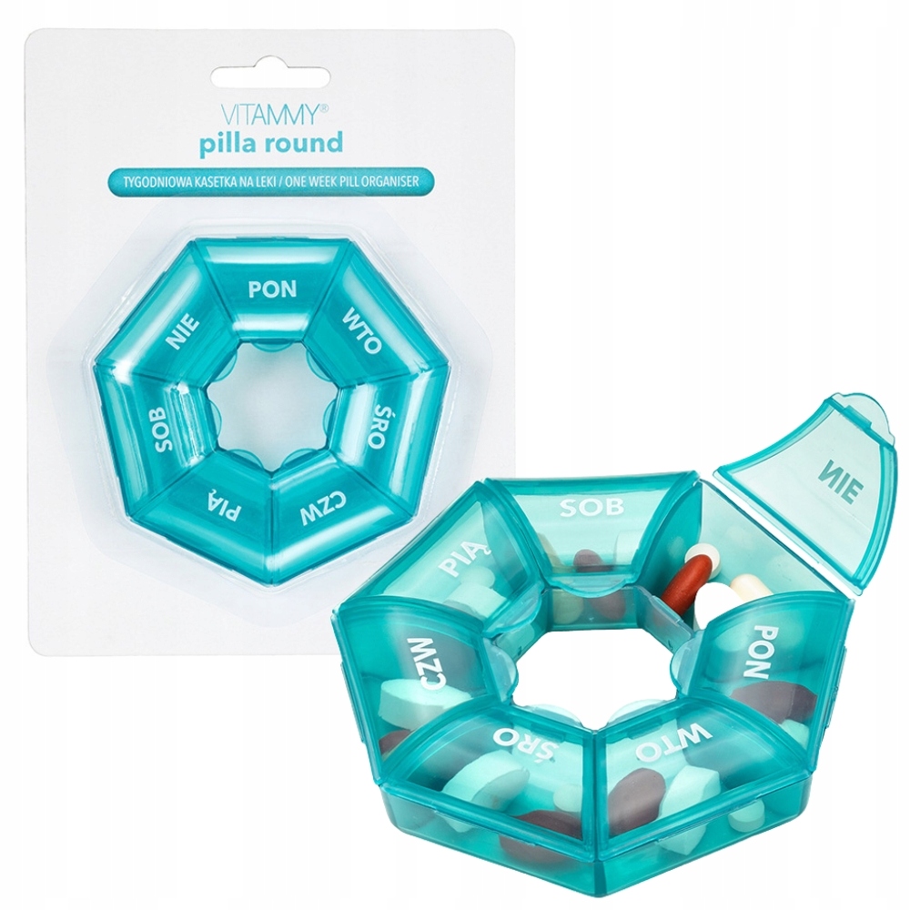 Porządek w przyjmowaniu leków – w wygodnej, nowoczesnej formie! Vitammy Round to praktyczny, okrągły pojemnik z 7 osobnymi przegrodami, przeznaczonymi na każdy dzień tygodnia.