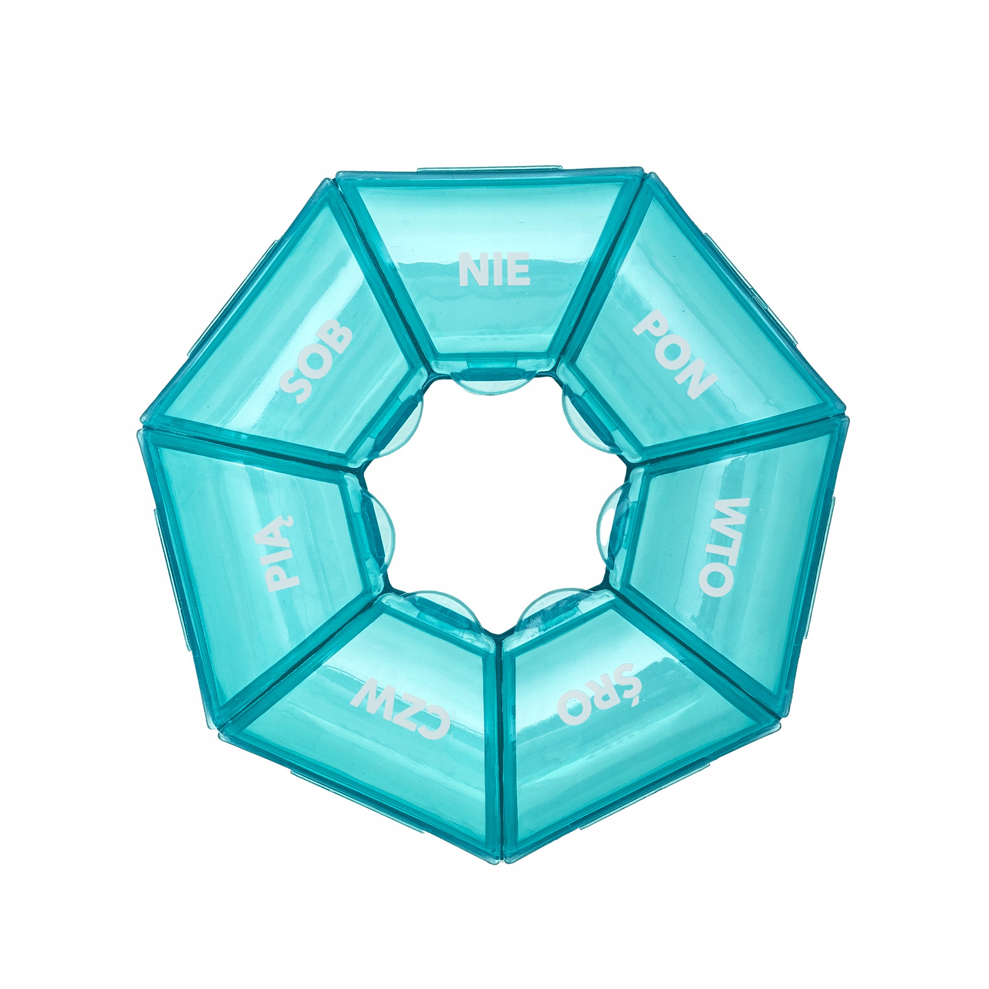 Każda przegroda została oznaczona skrótem dnia tygodnia w języku polskim, co ułatwia codzienną orientację i pozwala uniknąć pomyłek.