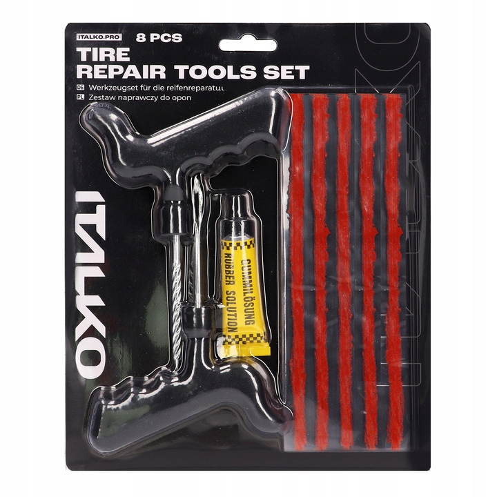 Zestaw sprawdzi się przy naprawie opon samochodów osobowych, ciężarowych, terenowych, quadów i motocykli.
