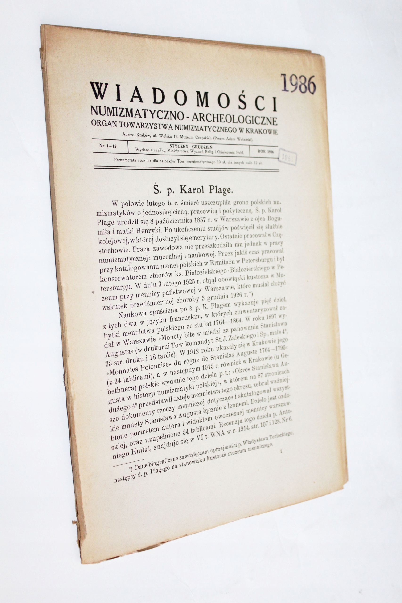 Название WIADOMOŚCI NUMIZMATYCZNO ARCHEOLOGICZNE ROK 1926 STYCZEŃ - GRUDZIEŃ