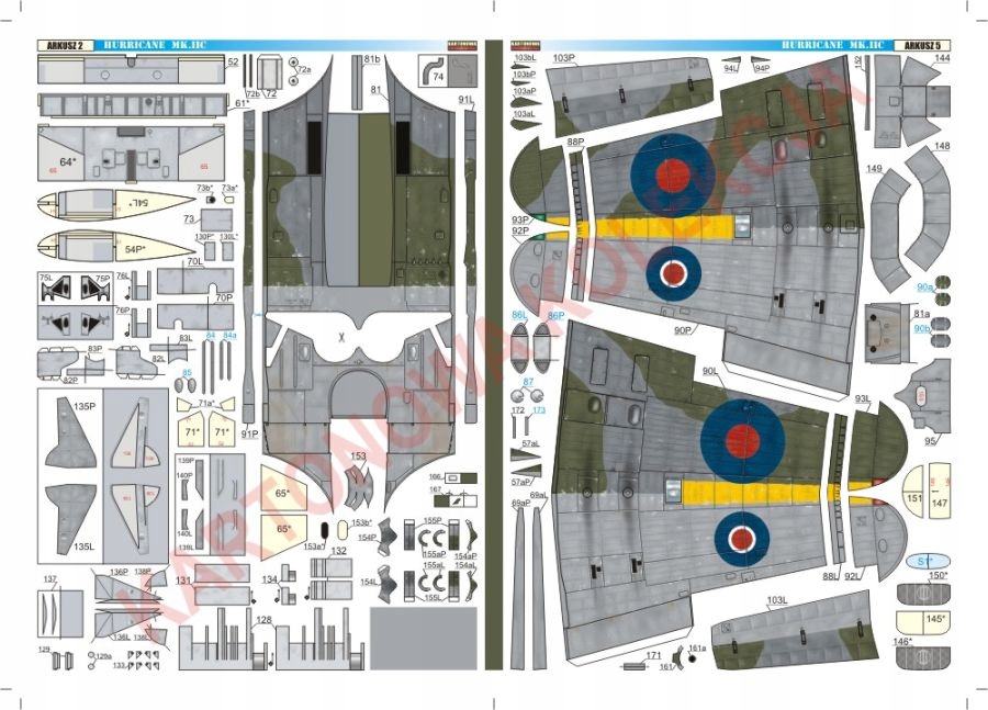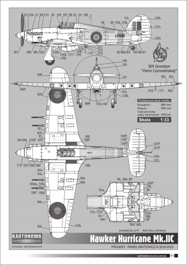 Model kartonowy samolotu myśliwskiego Hawker Hurricane Mk IIC. Model przedstawia maszynę w oznakowaniu polskiego 309 Dywizjonu myśliwsko rozpoznawczego "Ziemi Czerwieńskiej". Samoloty tego typu znajdowały sie na wyposażeniu tej jednostki w okresie od kwietnia do sierpnia 1944 roku. Model średniotrudny w budowie, waloryzowany graficznie. Posiada bogate wyposażenie kabiny pilota i wnęki komory podwozia oraz możliwość wykonania dzielonych powierzchni sterowych (lotki, stery).