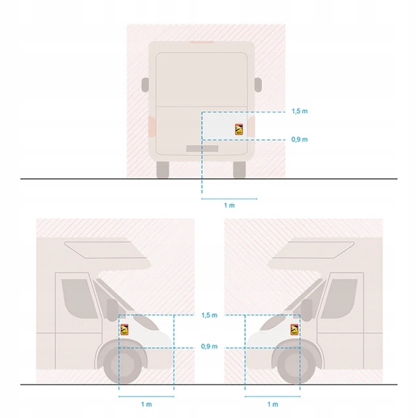 Obowiązkowa naklejka ostrzegawcza "ATTENTION ANGLES MORTS" (pol. „Uwaga! Martwe pole”) dla pojazdów poruszających się po terytorium Francji.Zgodnie z francuskimi przepisami obowiązującymi od 1 stycznia 2021 roku, wszystkie pojazdy o DMC powyżej 3,5 tony, w tym kampery i pojazdy kempingowe, muszą być oznaczone specjalną tablicą ostrzegawczą informującą o strefach ograniczonej widoczności (tzw. martwe pola – angles morts).