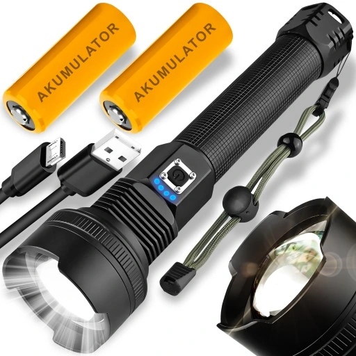 Dołączony akumulator o dużej pojemności pozwala na wielogodzinne korzystanie z latarki. Ładowanie odbywa się za pomocą dołączonej do zestawu ładowarki.