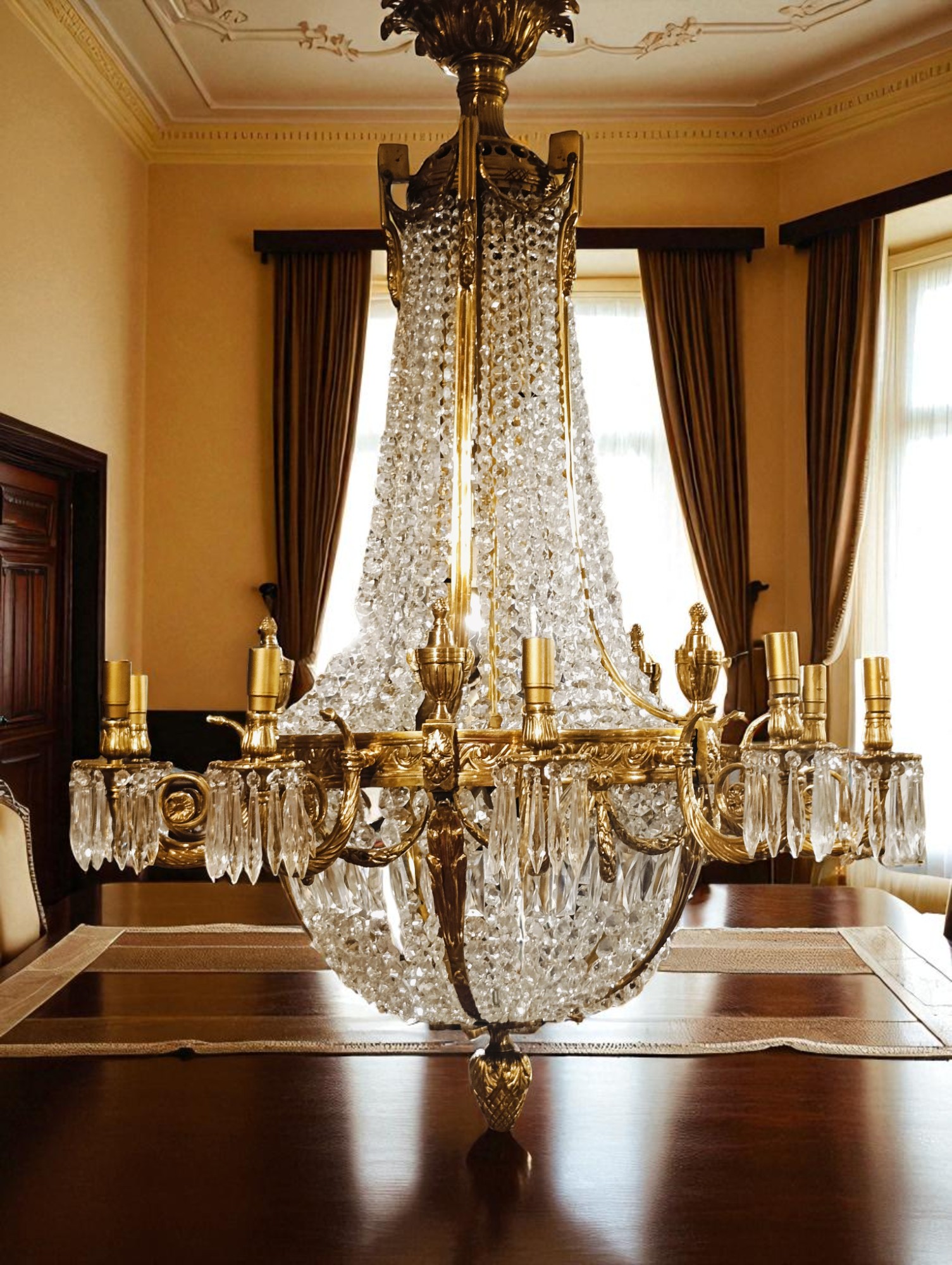 Lampa bardzo ozdobna i atrakcyjna, w bardzo dobrym stanie (wymieniona instalacja i oprawki; jest po gruntownym czyszczeniu mosiądzu). Wykonana około 70-80 lat temu; została przywieziona z Francji.