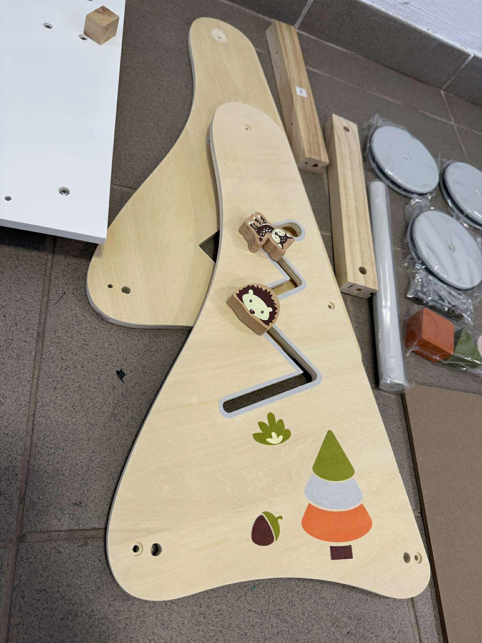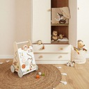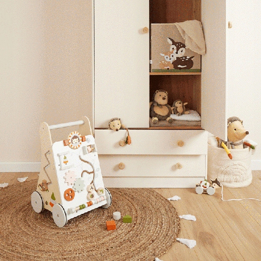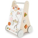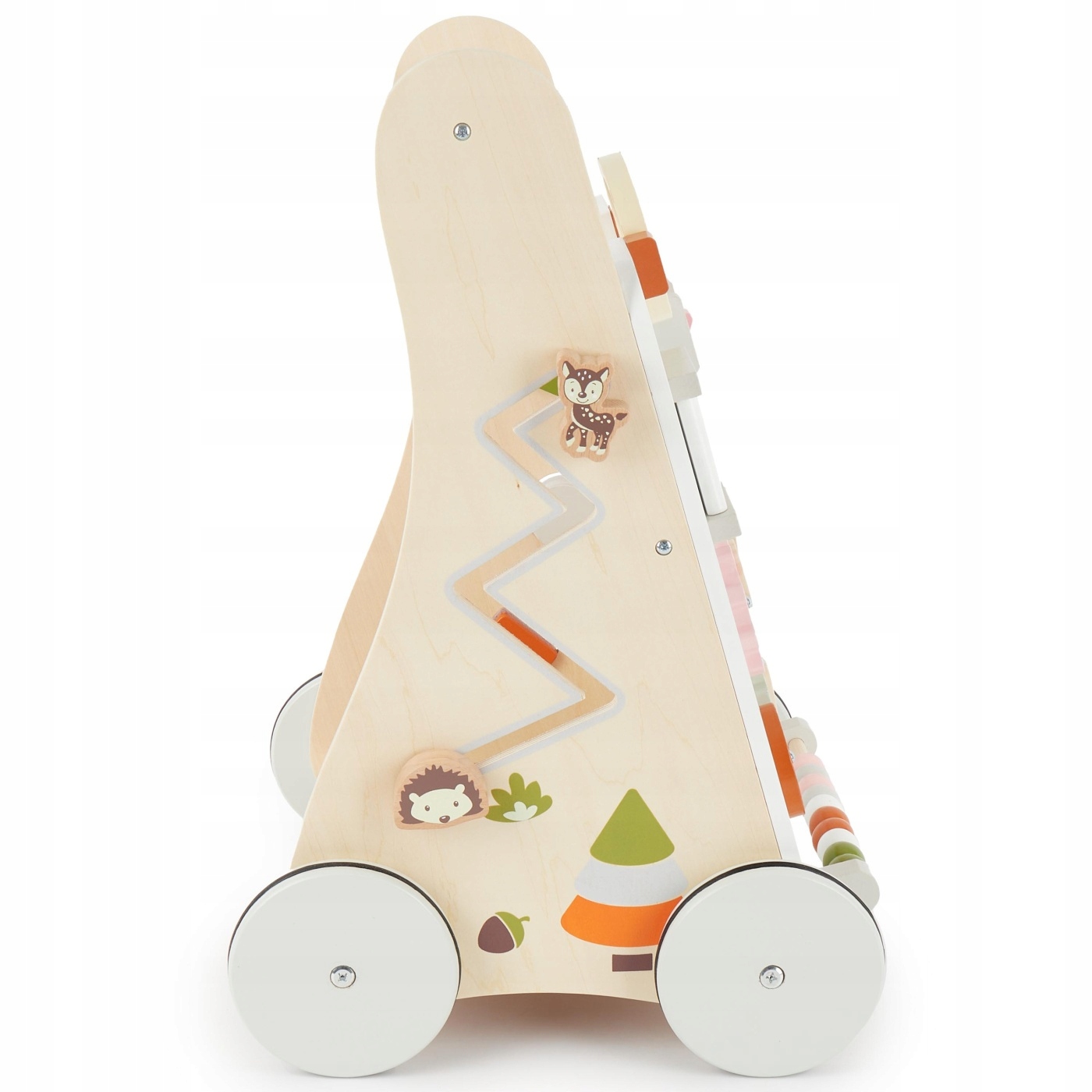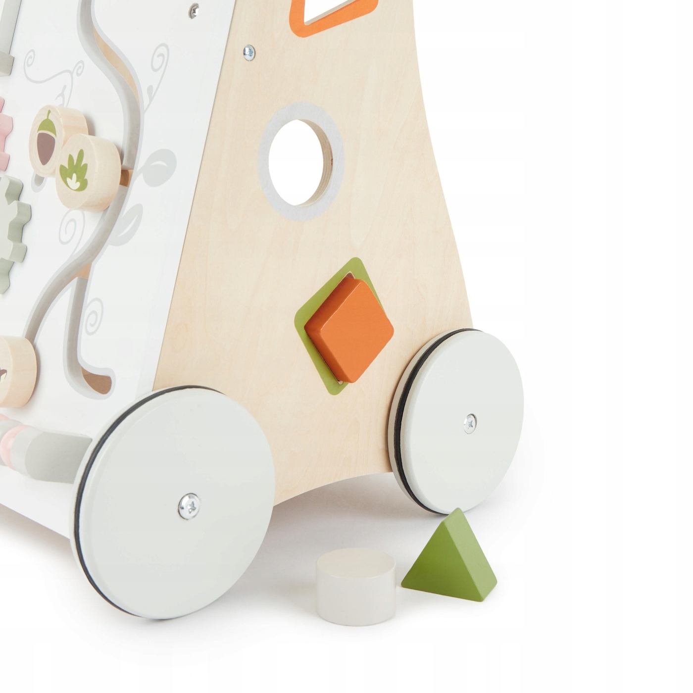 Ten drewniany wózek z aktywnościami to idealny towarzysz dla ciekawskich maluchów stawiających pierwsze kroki podczas odkrywania świata. Jego stabilna konstrukcja zachęca do nauki chodzenia, a jego motoryczne i interaktywne aktywności stymulują koordynację i umiejętności motoryczne.