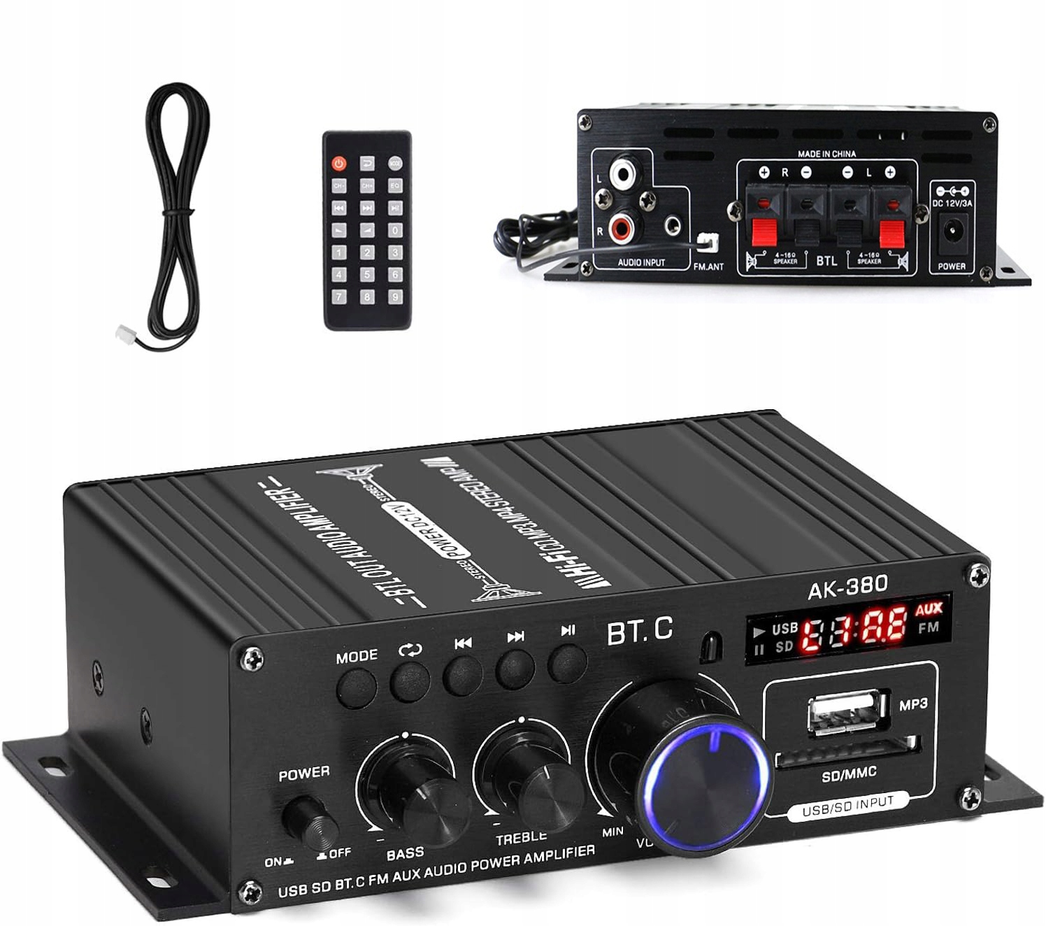 ✅ Szerokie zastosowanie - Odbiornik stereo AK380 z mocą znamionową Bluetooth 40 W i głośnikami 4-16 Ω. Wzmacniacz mocy z pilotem, odczytujący dysk U i kartę pamięci, plug and play, obsługuje połączenie bezprzewodowe BT, z zasilaczem 12 V 5 A do podłączenia urządzeń. Obsługuje również wejście AUX RCA i 3,5 mm, USB i radio FM.