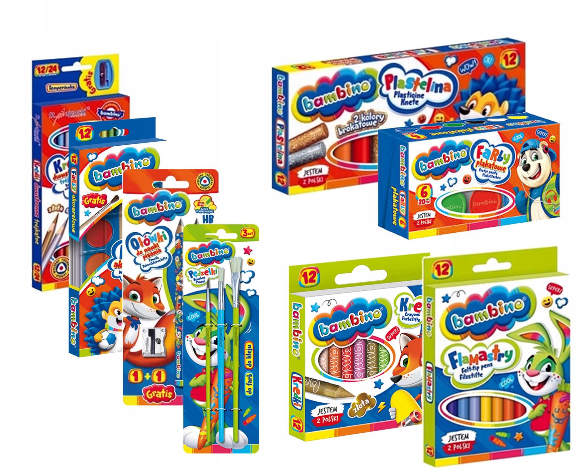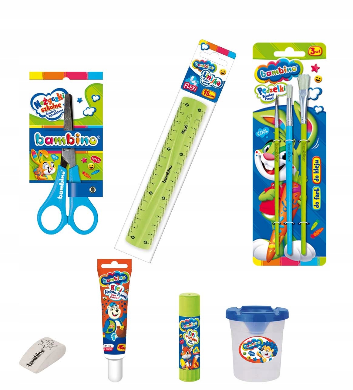 Zestaw zawiera wszystko, co potrzebne na początek szkoły – od kredek po plastelinę – idealny dla uczniów młodszych klas. Piękne kolory, markowe produkty Bambino, porządne wykonanie i atrakcyjne opakowanie czynią go także świetnym pomysłem na prezent.
