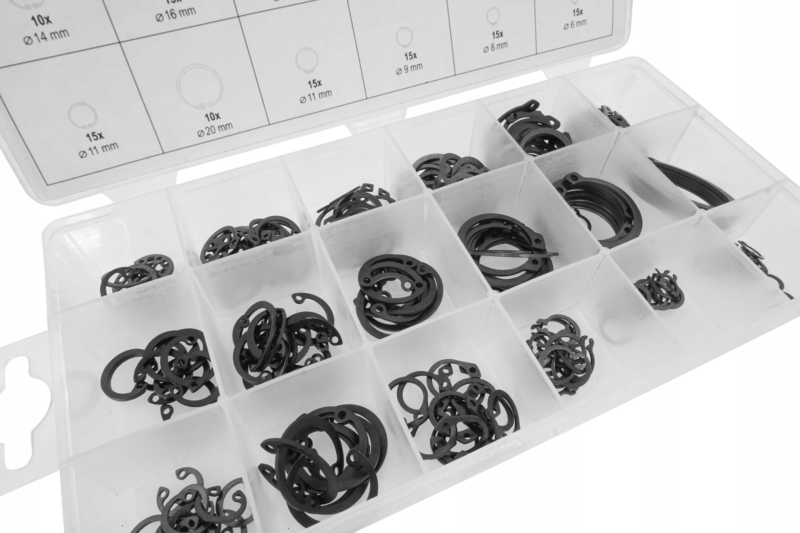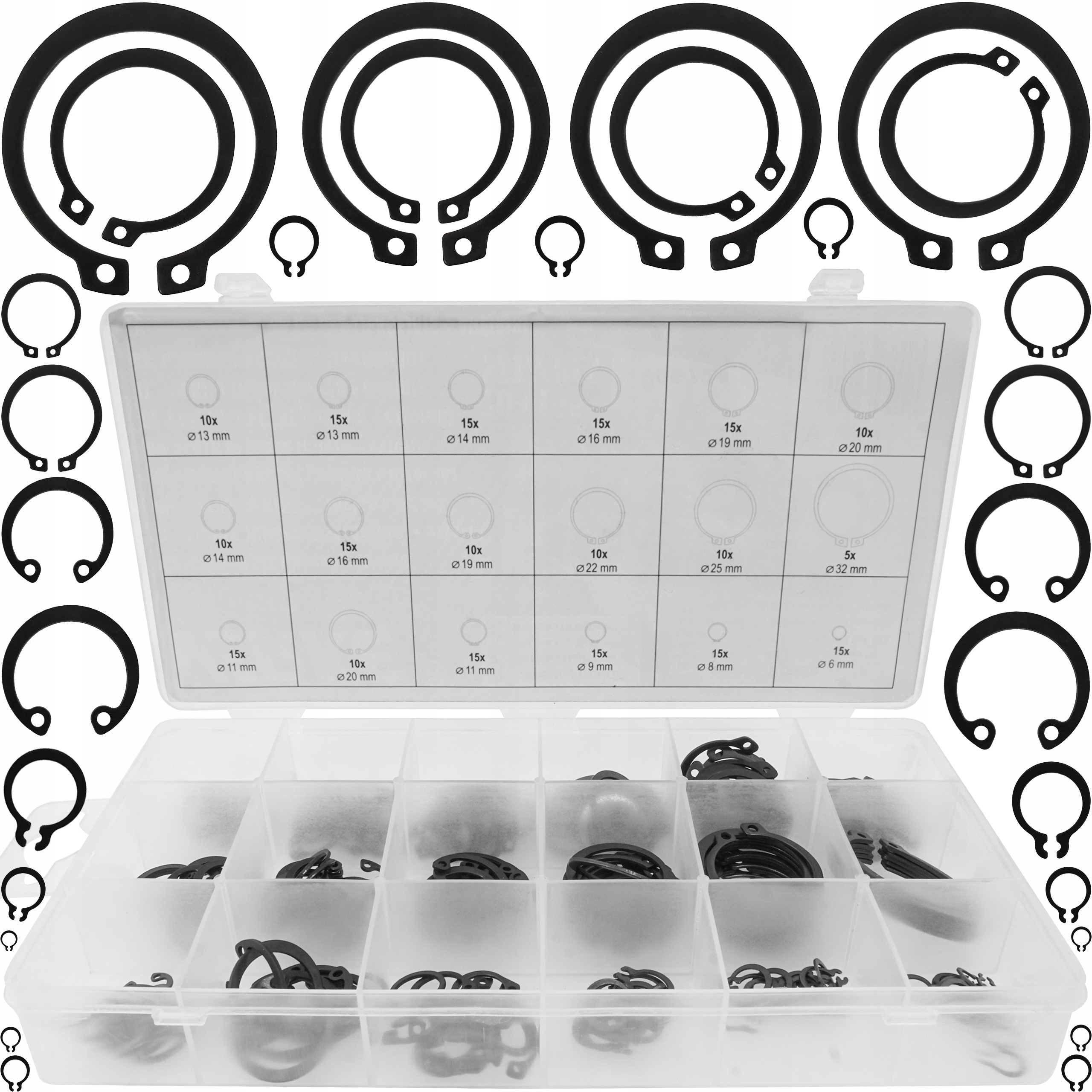 Набор из 225 шт. колец Сегера экстерьера и интерьера. В комплект входят размеры от 6 мм до 32 мм. Все помещено в удобная упаковка типа "сортировщик".