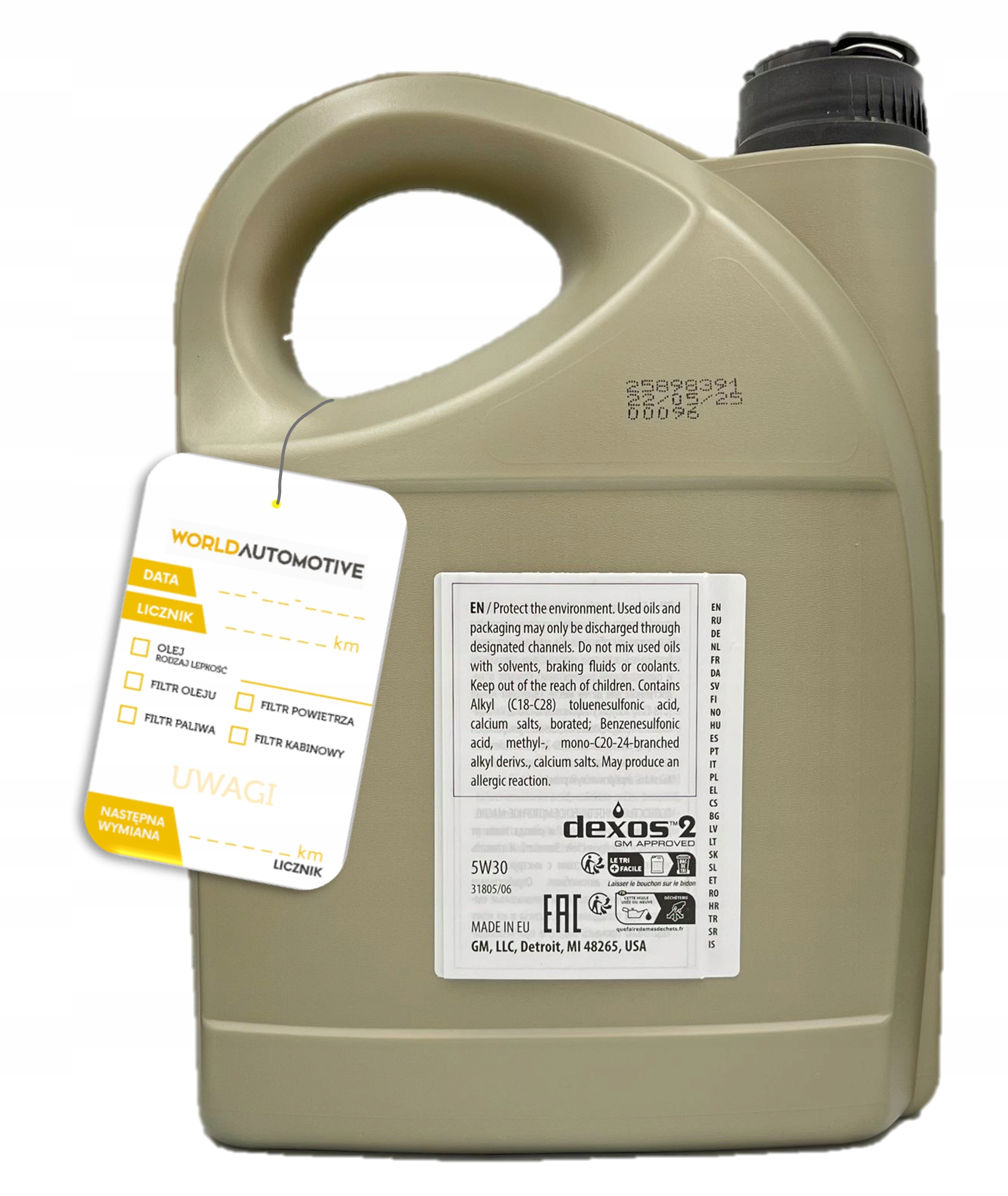 Полностью синтетическое масло GM dexos2 5W30 предназначен для использования в бензиновых и дизельных двигателях автомобилей легковые и легкие фургоны. Особенно рекомендуется для автомобилей марки: Chevrolet, Opel и Сааб. Высокое содержание чистящих добавок позволяет поддерживать внутреннюю часть двигателя в идеальном состоянии чистота на многие тысячи километров. Масло GM dexos2 5W30-это продукт, отвечающий требованиям в соответствии с стандартами ACEA C3 и GM Dexos2™, он был изготовлен в экологически чистой Формуле Low SAPS, поэтому его можно использовать в самых современных конструкциях с фильтром частиц DPF / FAP и трехходовой каталитический реактор TWC. Низкое собственное трение значительно это приводит к снижению расхода топлива и увеличению срока службы агрегата приводной. Масло GM dexos2 5W30 - это масло в стандарте LongLife - есть возможность удлинения пробегов между сменами
