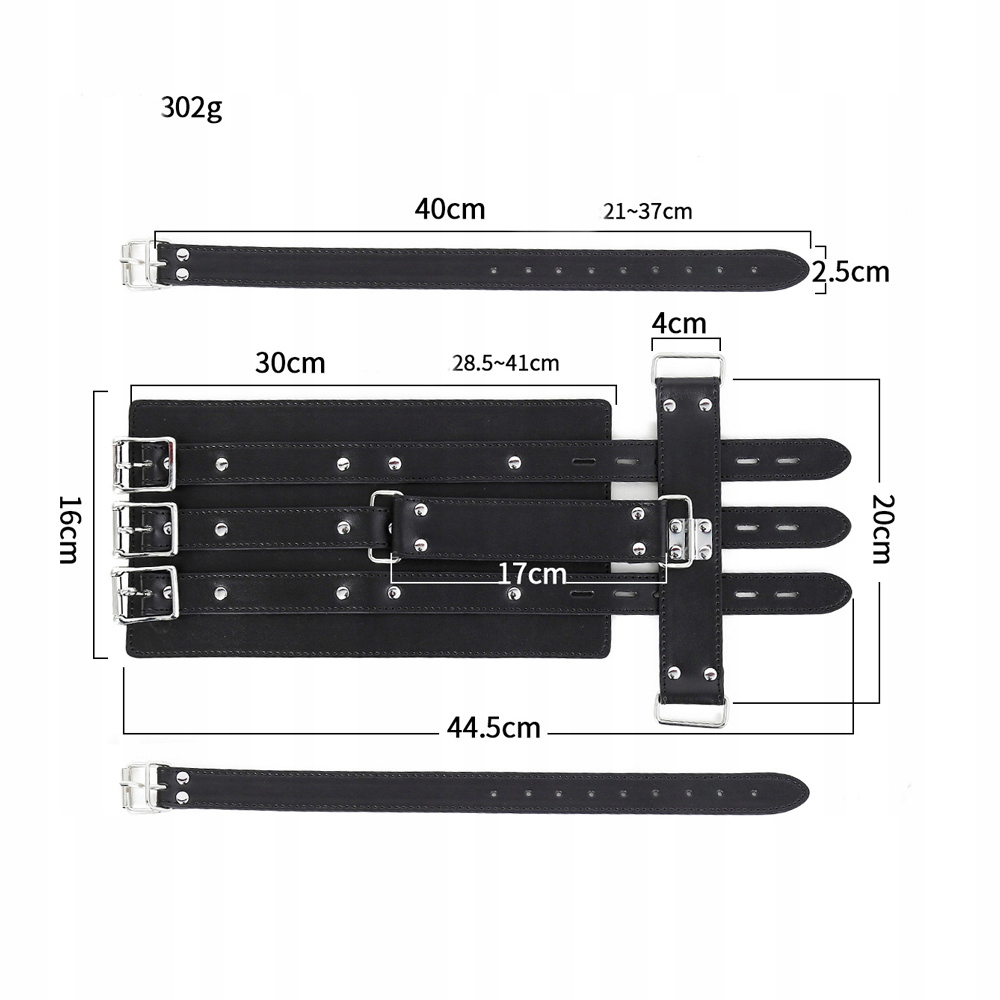 Wymiary: Pasek poziomy ma 9 cali szerokości. Pasek pionowy ma 8 cali. Paski na bicepsy regulują się od 9,5 do 15,75 cala obwodu. Pasek na przedramiona ma maksymalną długość 17,5 cala, regulowaną od 9,5 do 14,25 cala obwodu, o szerokości 6,5 cala.