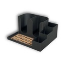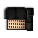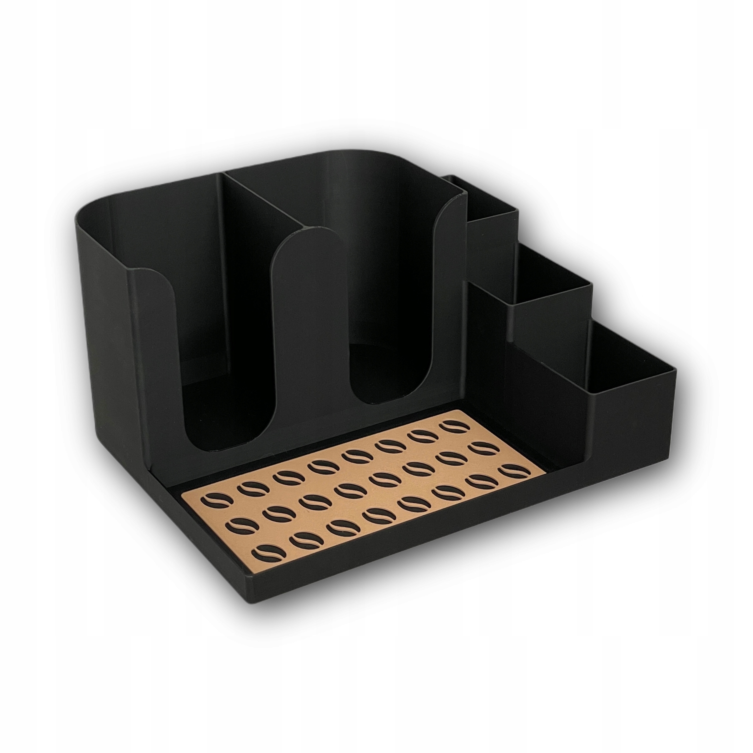 Dodatkowo wyposażony jest w trzy mniejsze przegródki, idealne na mieszadełka, cukier, słodziki czy inne drobne akcesoria. Całość uzupełnia jedna większa komora z eleganckim wykończeniem, która może pełnić funkcję podstawki na kubki lub serwetki.