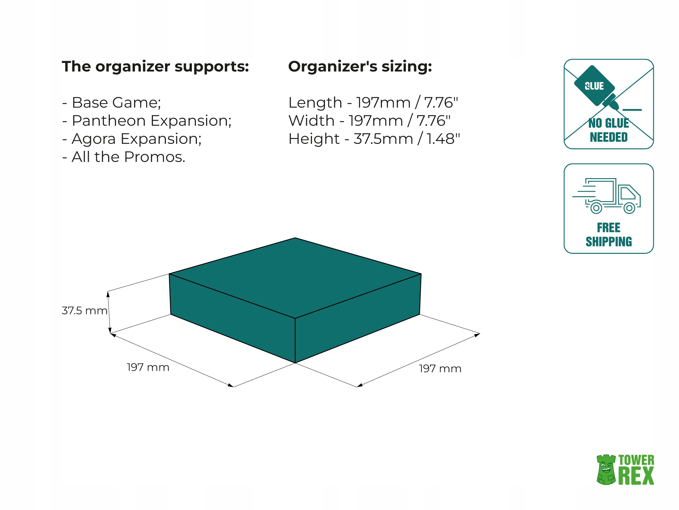 Ten doskonały organizer do gry planszowej „7 Cudów Świata: Pojedynek” wraz z dodatkami „Panteon” i „Agora” został wykonany z MDF. Przegródki pomieszczą karty w koszulkach. Złożenie organizera zajmuje zaledwie pięć minut, a użycie kleju nie jest wymagane.