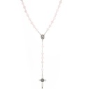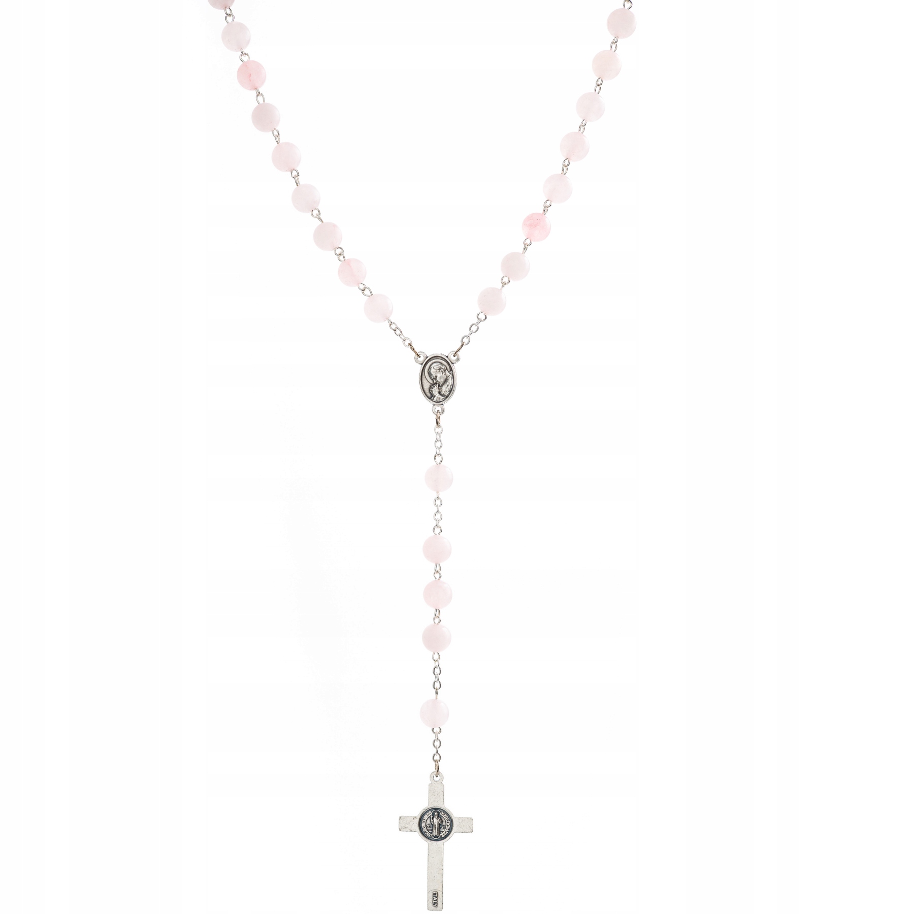 Ten różaniec wykonano z naturalnych kamieni kwarcu różowego – w subtelnych odcieniach mlecznego różu, z delikatnym połyskiem i niepowtarzalnym wzorem. Każdy egzemplarz różni się układem barw, co czyni go wyjątkowym.