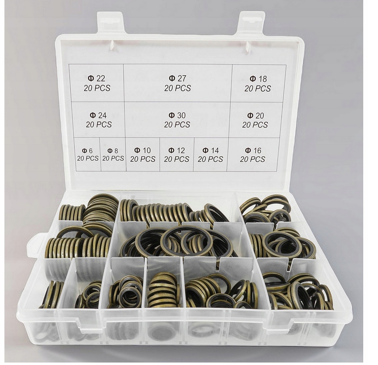 Zestaw metalowo-gumowych podkładek uszczelniających w rozmiarach od M6 do M30. Wykonane z metalu i gumy posiadają dobre właściwości uszczelniające, są odporne na wysokie ciśnienie i olej.