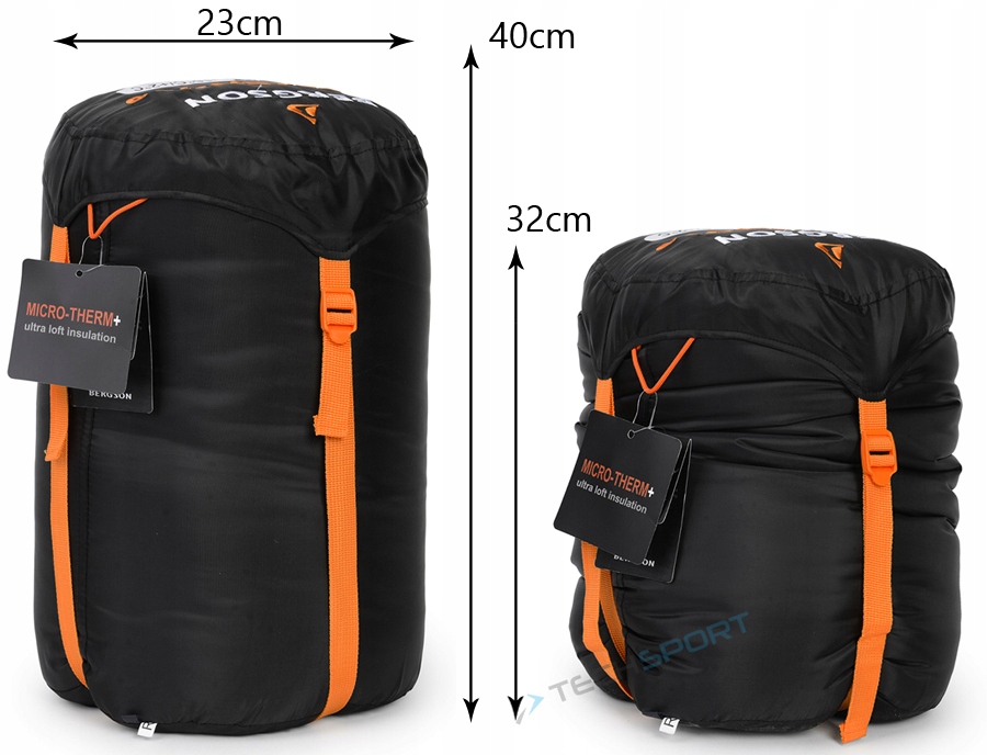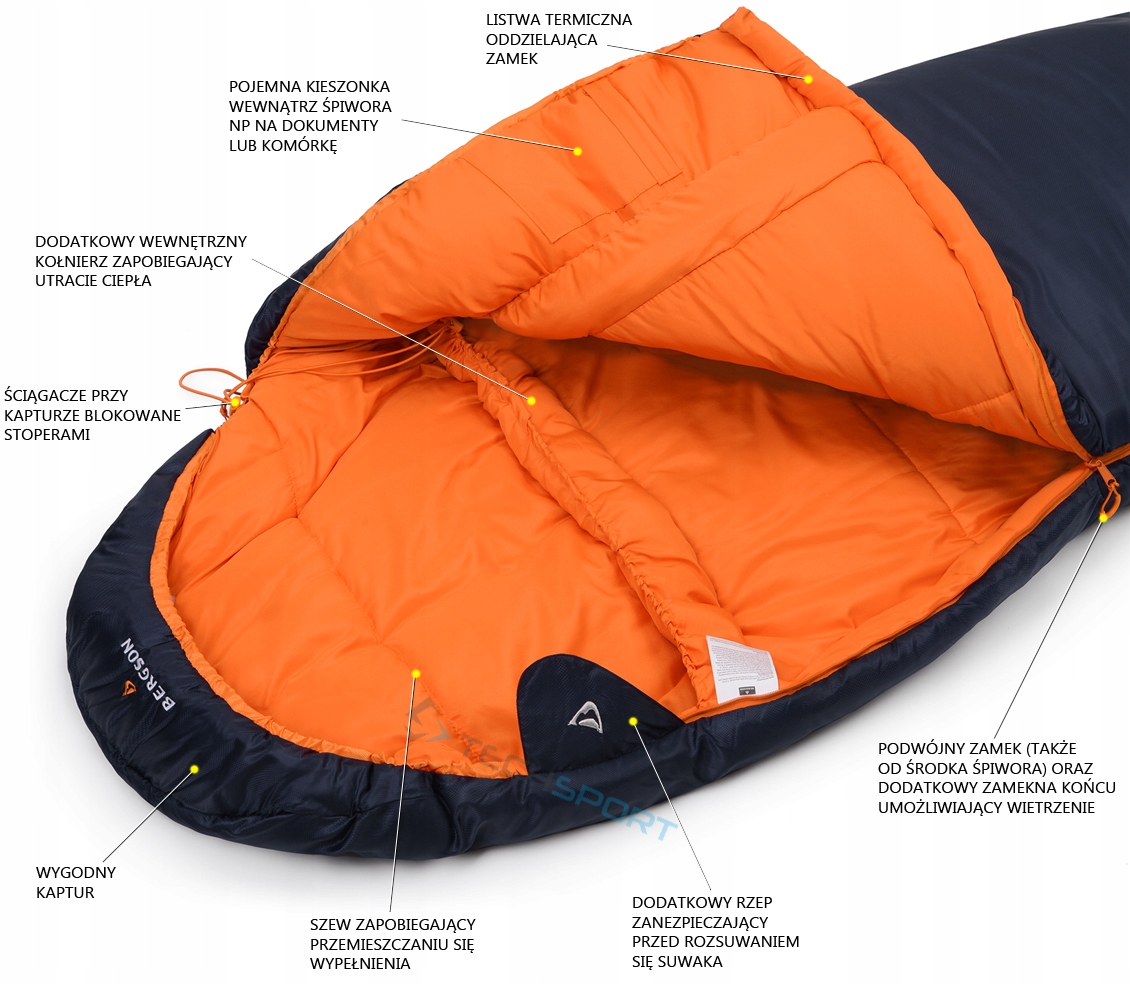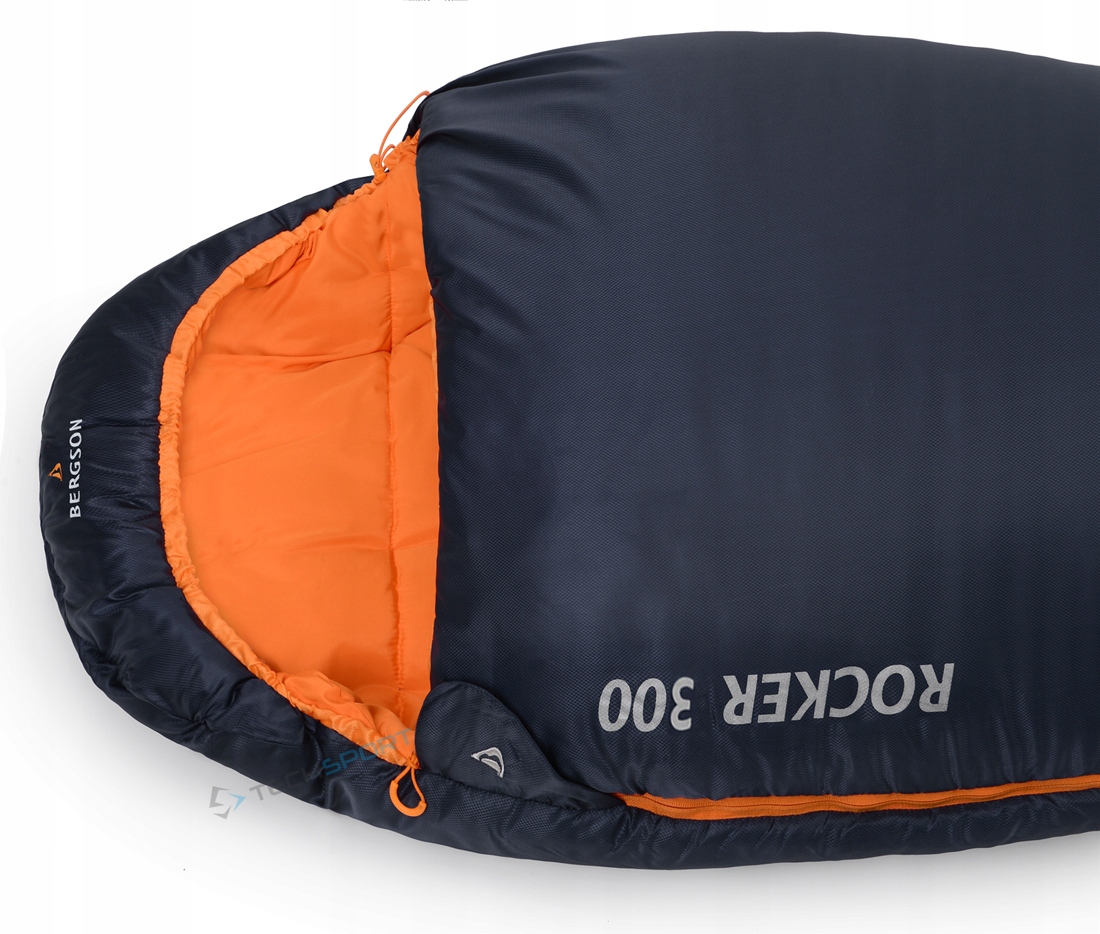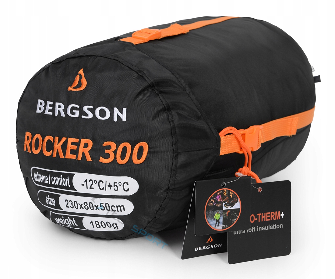 Wysokiej jakości markowy śpiwór Bergson Rocker 300. Charakteryzuje się najlepszymi właściwościami izolacyjnymi, bardzo wysoką jakością wykonania oraz opatentowanymi technologiami takimi jak struktura wypełnienia: MICRO-THERM© i nowoczesne mocne tkaniny: Ripstop RHOMBUS (tkanina o klasę lepsza od zwykłego poliestru). Dzięki temu uzyskuje realne ekstremum na poziomie -12st. Śpiwór jest bardzo ciepły i gruby sprawdzi się zwłaszcza w okresie jesień-zima-wiosna lub latem dla zmarzluchów. Posiada dwubiegowy zamek, umożliwiający rozpinanie również od dołu oraz regulację temperatury w śpiworze. Dodatkowa taśma systemu Anti-Bite zabezpiecza materiał przed wcinaniem w zamek. Dostępny z zamkami po prawej jak i lewej stronie, dzięki temu można je łączyć w jeden duży śpiwór. Praktyczny pokrowiec posiada dodatkowo pasy kompresujące regulujące wielkość spakowane śpiwora oraz uchwyt do przenoszenia. Śpiwór nowy, oryginalny, z kompletem metek.