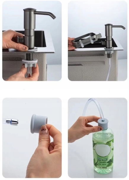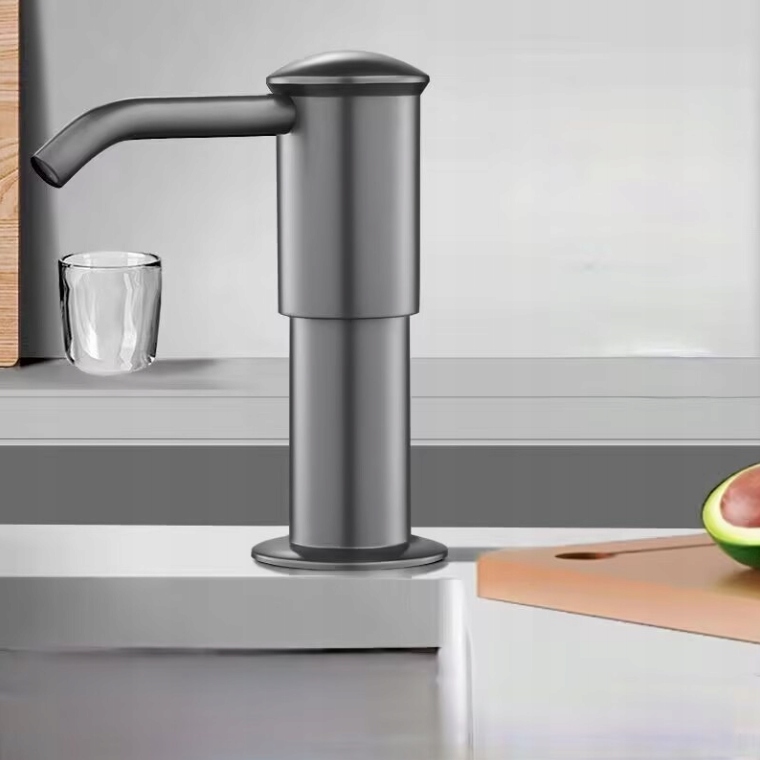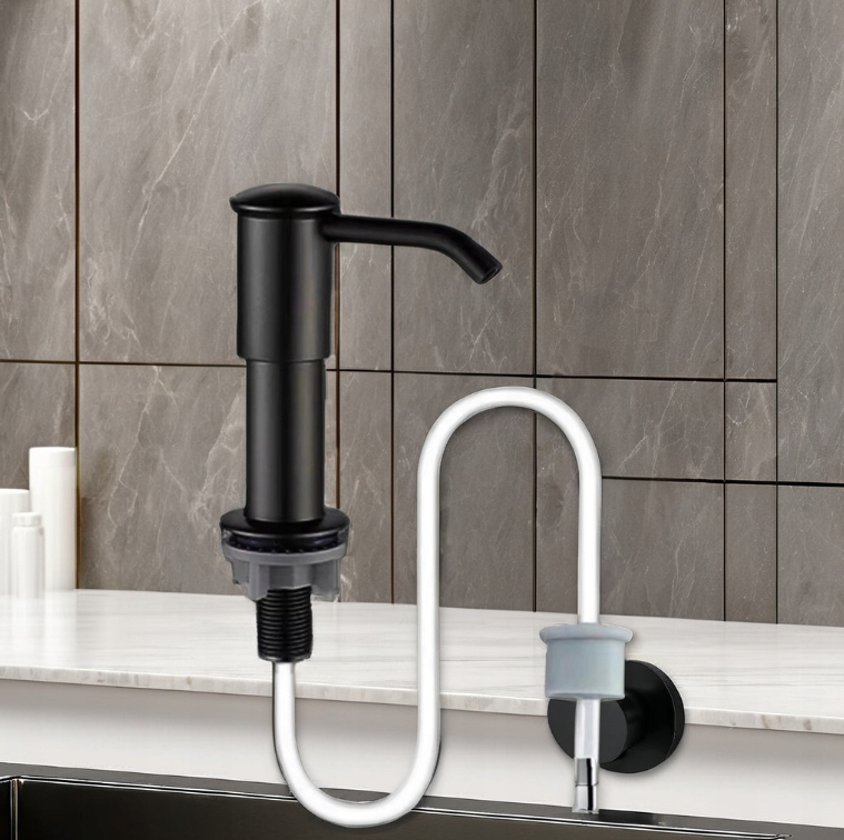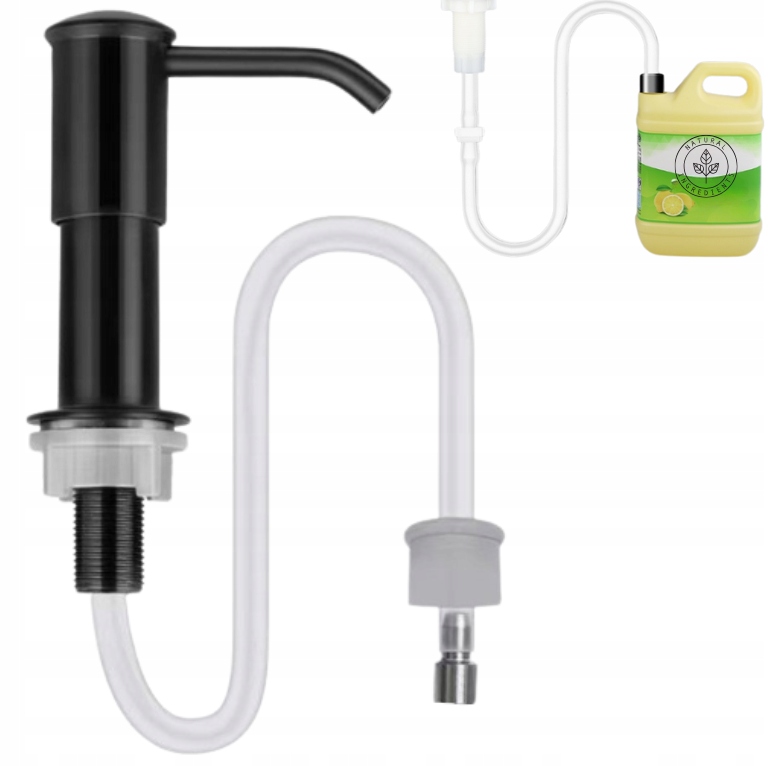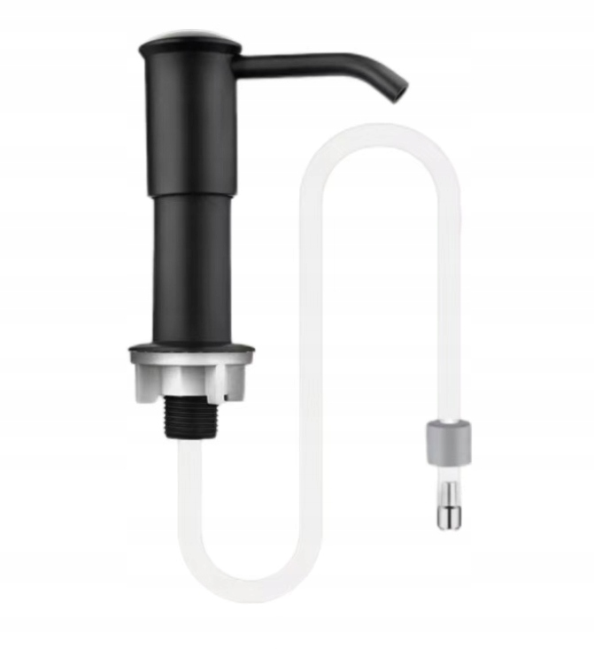 Nowoczesny, nablatowy dozownik w kolorze czarnego matu, wykonany z odpornej na korozję stali nierdzewnej. Wyposażony w 1-metrową rurkę przedłużającą z kulką grawitacyjną (Gravity Ball), która zapewnia stały dostęp do płynu, nawet gdy butelka znajduje się głęboko pod blatem.