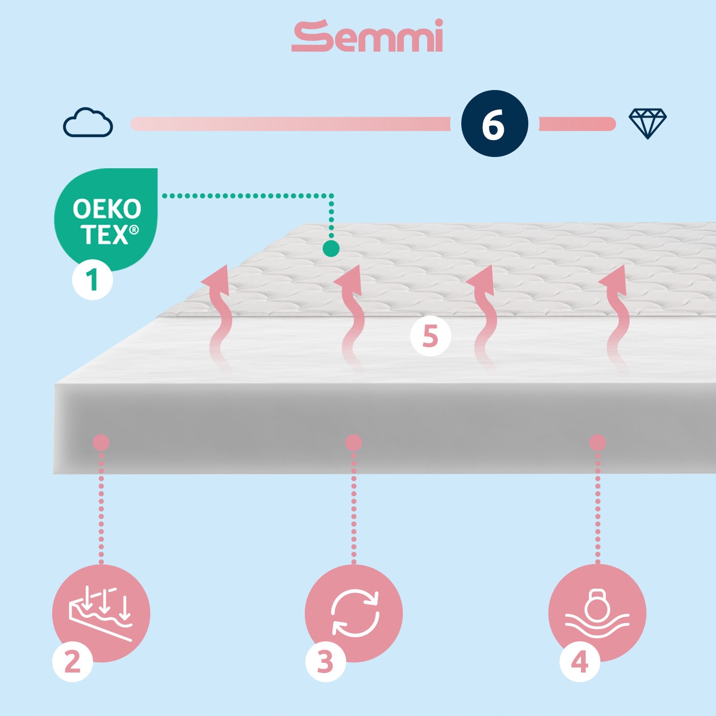 5️⃣Doskonała wentylacja i komfort termiczny: Nasze materace zostały zaprojektowane z myślą o zapewnieniu odpowiedniego przepływu powietrza. Dzięki przewiewnym materiałom i oddychającej strukturze pianki, możliwa jest skuteczna regulacja temperatury podczas snu. To ogranicza ryzyko przegrzewania się i zapewnia komfort przez całą noc.
