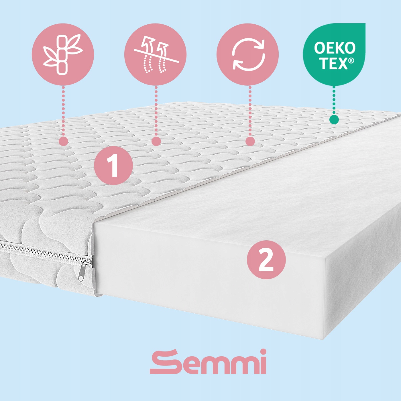 3️⃣ Dwustronny pokrowiec – łatwy w utrzymaniu czystości: Materac wyposażony jest w zdejmowany, dwustronny pokrowiec, który można łatwo wyprać. Taka konstrukcja nie tylko ułatwia utrzymanie higieny na co dzień, ale także pozwala na równomierne użytkowanie obu stron materaca, co dodatkowo wydłuża jego żywotność.