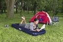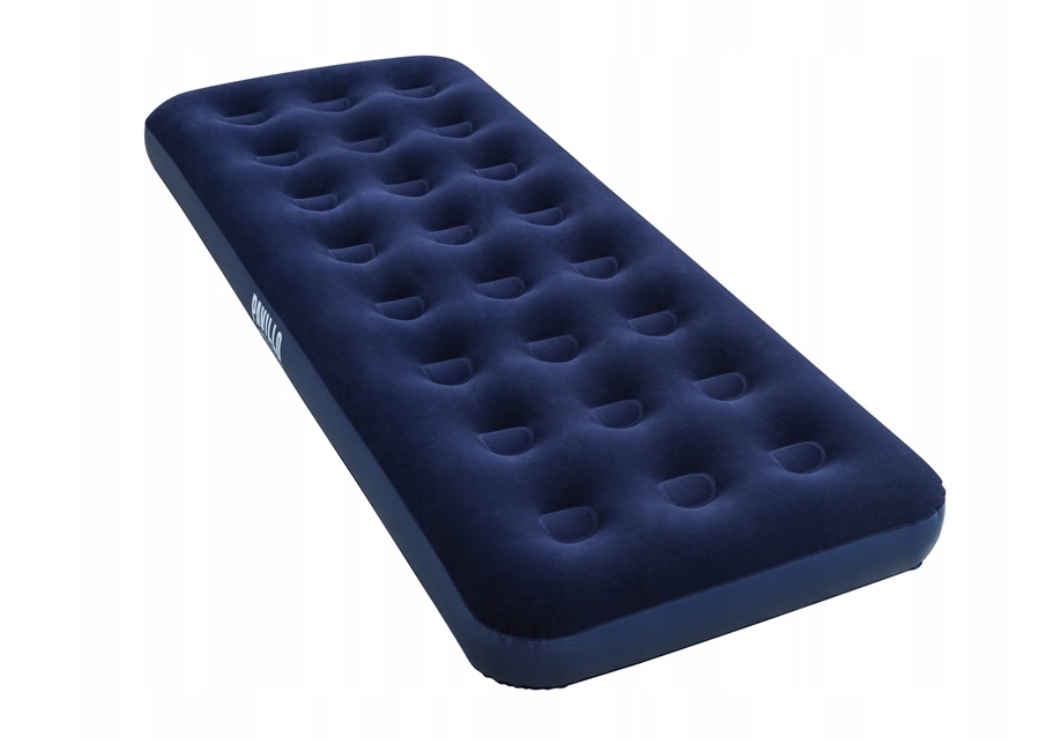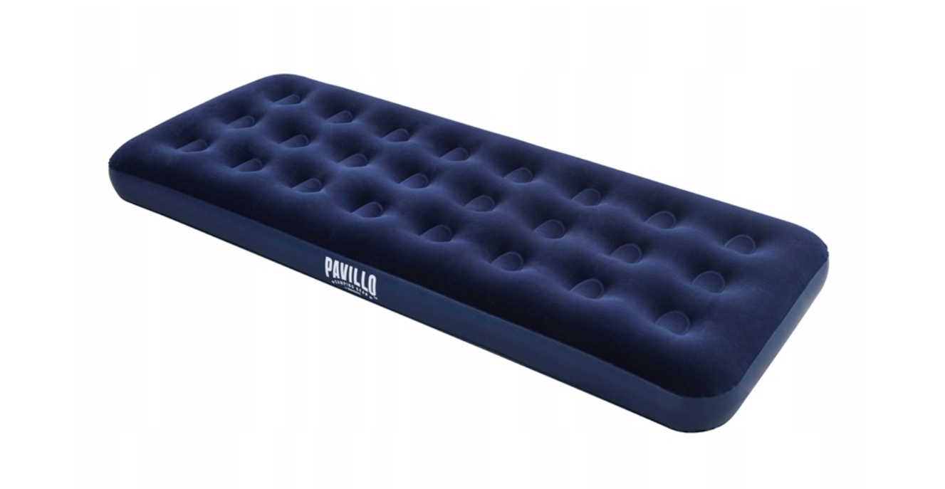 Materac został wykonany z wytrzymałego materiału PVC pokryty na górnej części miękkim welurem w kolorze granatowym. Nadaje się zarówno do użytku wewnętrznego jak i zewnętrznego, idealnie sprawdzi się pod namiotem lub w domu jako zapasowe łóżko dla gości.