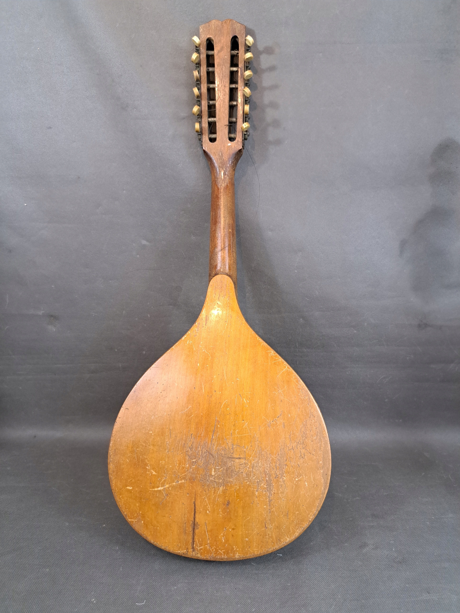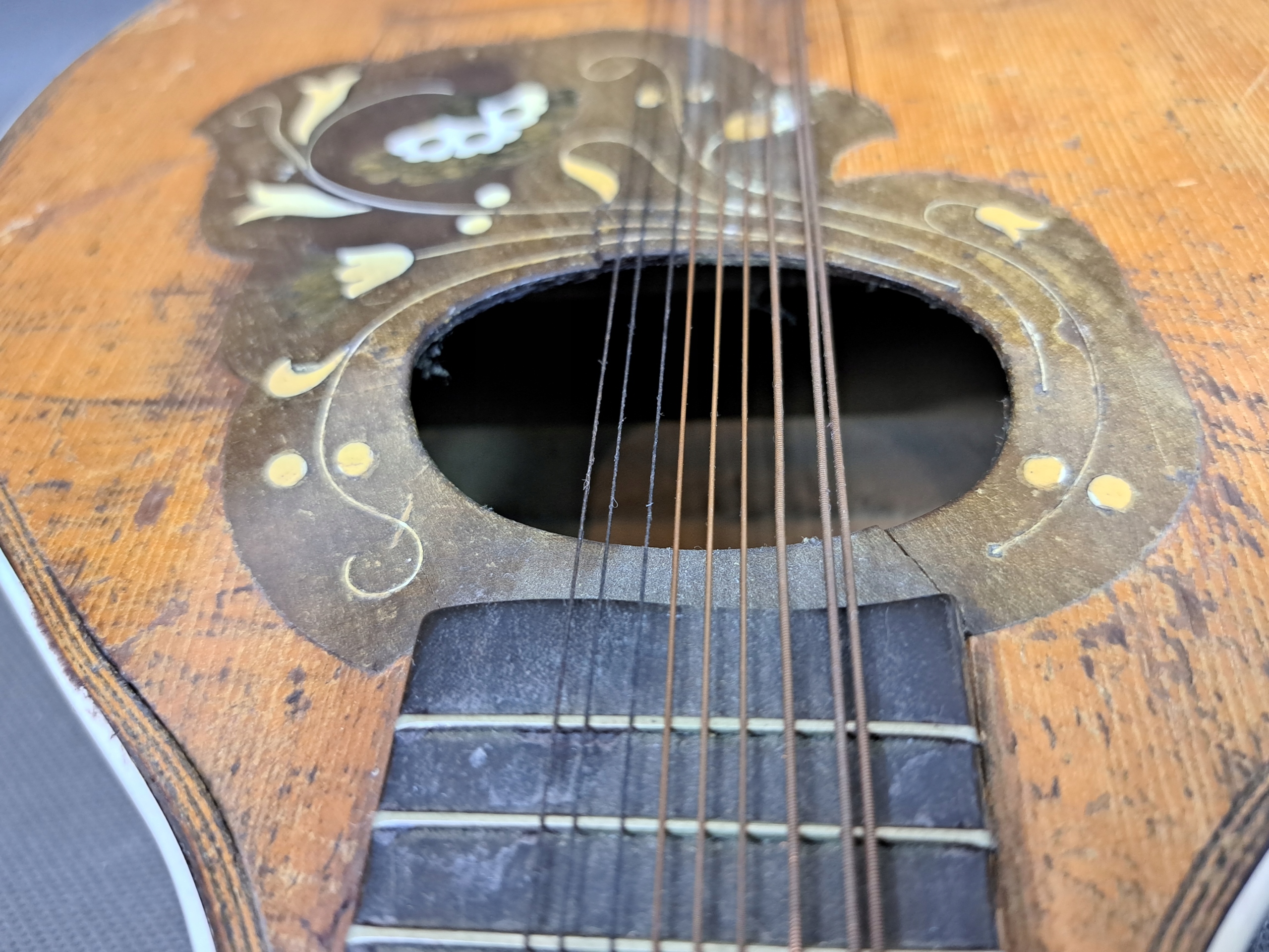 Stara mandolina. Ozdobiona intarsją w postaci kwiatków.