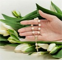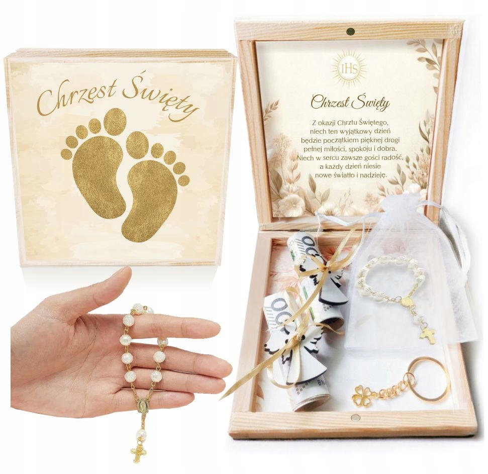Wewnątrz tego pięknego pudełka znajdziesz piękny perłowy różaniec oraz złoty breloczek, który będzie towarzyszył nowo ochrzczonej osobie w jej duchowej podróży.