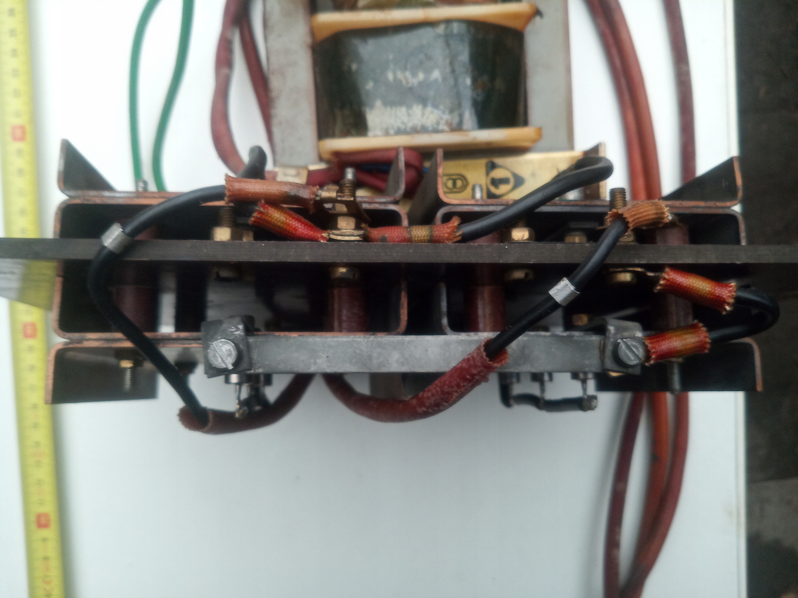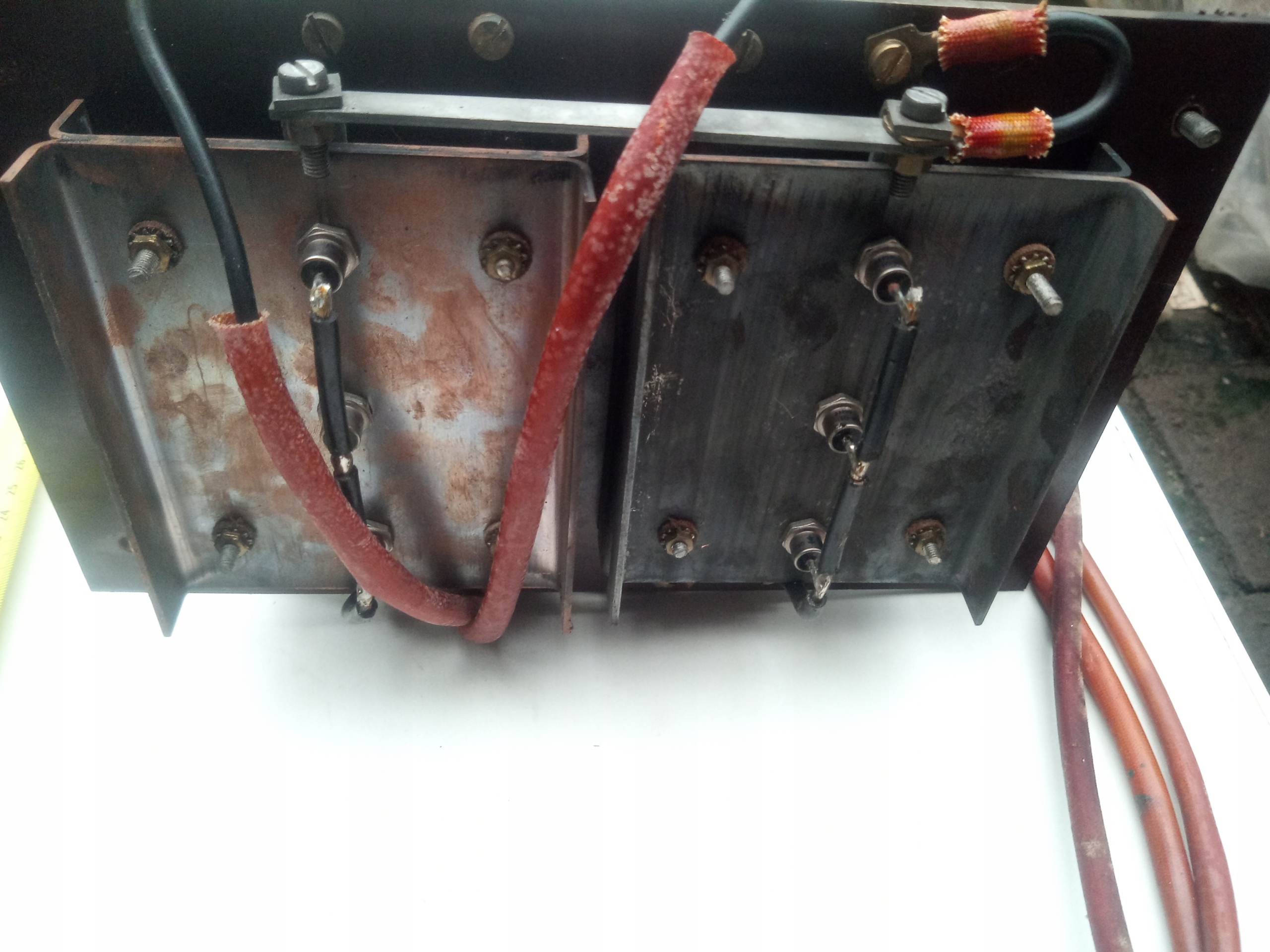 Prostownik jedno połówkowy zbudowany z 12 diod zamontowanych na grubych miedzianych blachach pełniących rolę radiatora.